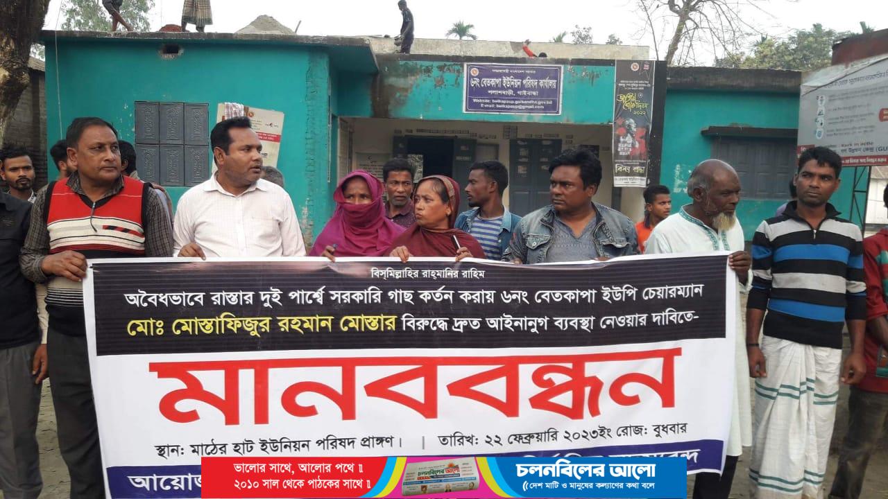 গাইবান্ধার পলাশবাড়ীতে গোপনে রাস্তার গাছ বিক্রি করার প্রতিবাদে ইউপি চেয়ারম্যানের বিরুদ্ধে মানববন্ধন করেছে ইউপি সদস্যসহ এলাকাবাসী।