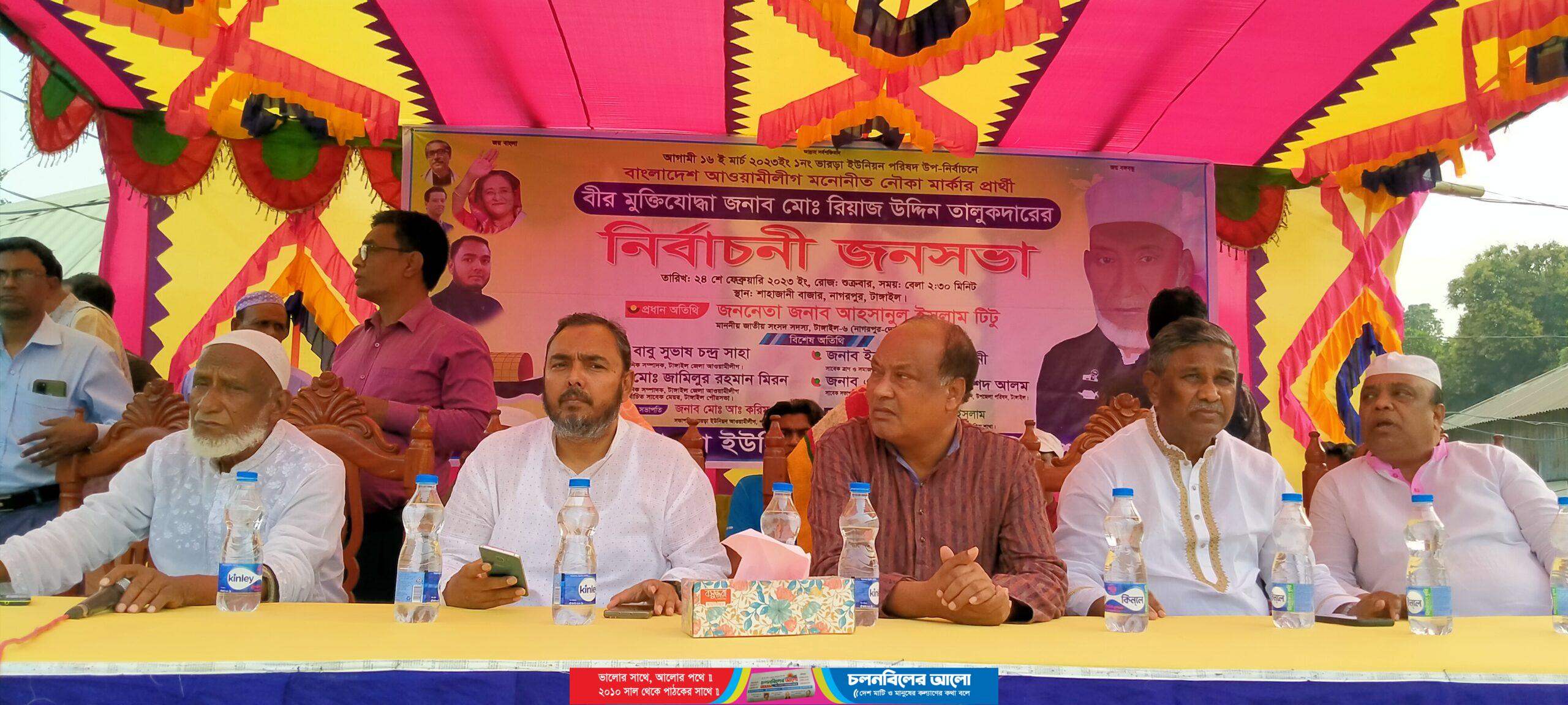 টাঙ্গাইলের নাগরপুরে ভারড়া ইউনিয়নের উপ-নির্বাচনে আওয়ামী লীগের মনোনীত প্রার্থী উপজেলা আওয়ামী লীগের সাবেক সভাপতি ও সাবেক চেয়ারম্যান বীর মুক্তিযোদ্ধা মো. রিয়াজ উদ্দিন তালুকদার কে বিজয়ী করতে জনসভা অনুষ্ঠিত হয়েছে। শুক্রবার বিকেলে ভারড়া পশ্চিম আওয়ামী লীগের আয়োজন এ জনসভার অনুষ্ঠিত হয়। ভারড়া পশ্চিম আওয়ামী লীগের সভাপতি মো. করিম তালুকদার এর সভাপতিত্বে ও সাধারণ সম্পাদক মো. রফিকুল ইসলাম এর পরিচালনায় প্রধান অতিথি হিসেবে বক্তব্য রাখেন, টাঙ্গাইল ৬ (নাগরপুর-দেলদুয়ার) আসনের সংসদ সদস্য আহসানুল ইসলাম টিটু। জেলা আওয়ামী লীগের সাবেক সাংগঠনিক সম্পাদক বাবু সুভাষ চন্দ্র সাহা, সাবেক মেয়র ও সাবেক  সাংগঠনিক সম্পাদক  জামিলুর  রহমান মিরন, সাবেক ত্রাণ ও সমাজ কল্যান বিষয়ক সম্পাদক ইনসাফ আলী ওসমানী,  টাঙ্গাইল সদর আওয়ামী লীগের সাবেক সভাপতি ও সাবেক উপজেলা পরিষদের চেয়ারম্যান এ্যাড. খোরশেদ আলম, নাগরপুর উপজেলা পরিষদের ভাইস চেয়ারম্যান মো. হুমায়ুন কবীর, গয়হাটা ইউনিয়নের চেয়ারম্যান উপজেলা আওয়ামী লীগের সাংগঠনিক সম্পাদক শেখ সামছুল হক, জেলা ছাত্রলীগের সাবেক আহবায়ক মোস্তাফিজুর রহমান সোহেল, চৌহালী উপজেলা পরিষদের ভাইস চেয়ারম্যান মোল্লা বাবুল আক্তার,  চৌহালী আওয়ামী লীগের সহ সভাপতি মো. হাবিবুর রহমান হাবিব, উপজেলা সেচ্ছাসেবক লীগের  সভাপতি মো. বাবর আল মামুন, উপজেলা ছাত্রলীগের সভাপতি আজিম হোসেন রতন প্রমুখ।
