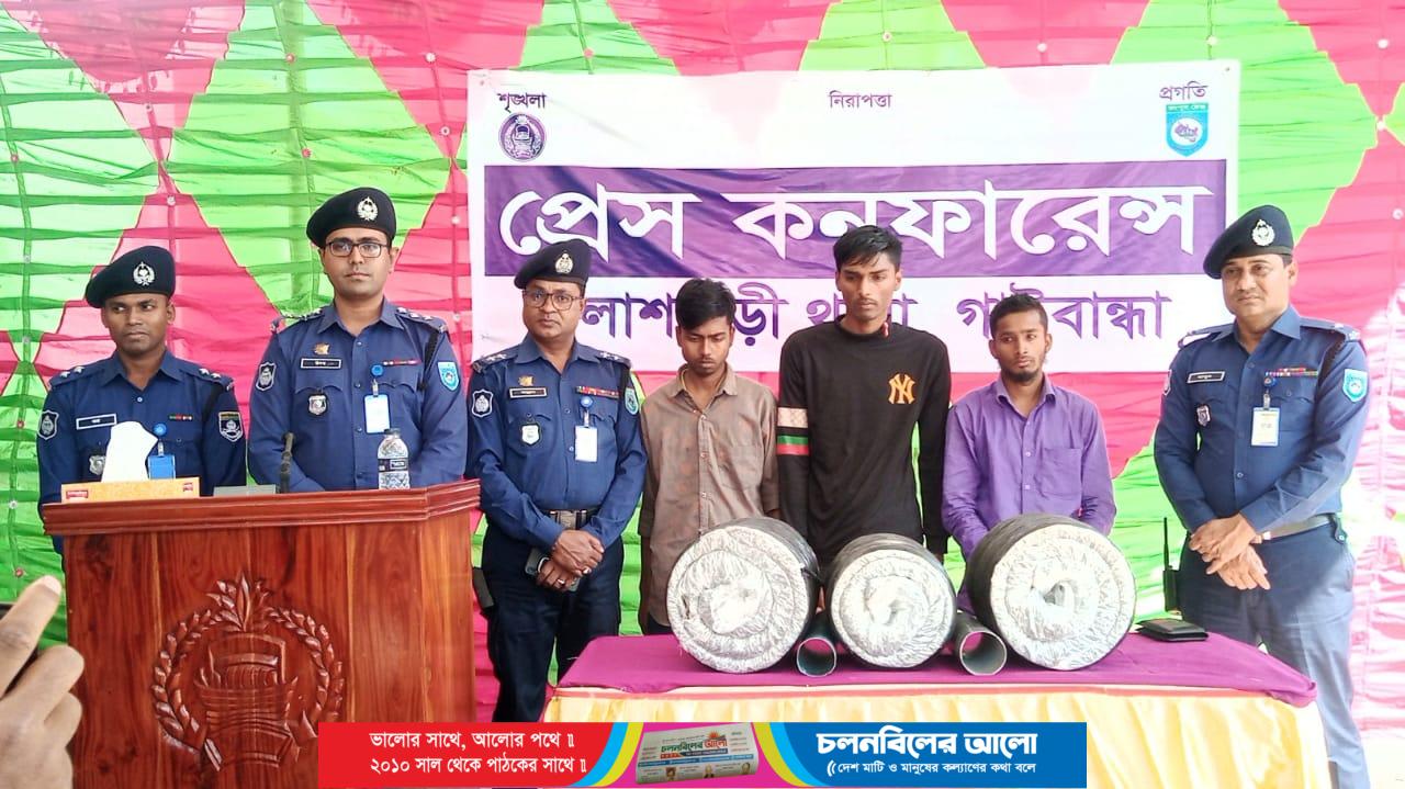 প্রেস কনফারেন্সে জানা যায়, গাইবান্ধা পুলিশ সুপার মোঃ কামাল হোসেনের দিক নির্দেশনায় জেলা পুলিশ অপরাধ রোধকল্পে নিয়মিত অভিযানের অংশ হিসাবে পলাশবাড়ী থানা পুলিশ ২৬ ফেব্রুয়ারী রবিবার সকাল ১১.৫৫ ঘটিকায় পলাশবাড়ী থানাধীন পলাশবাড়ী পৌরসভাস্থ ০১নং ওয়ার্ডের অন্তর্গত মহেশপুর মৌজাস্থ বিটিসি মোড়ের অনুমান ২০০ গজ দক্ষিনে জনৈক তপন কুমার রায়ের বসত বাড়ীর পশ্চিমে রংপুর হইতে বগুড়াগামী মহাসড়কের উপর রংপুর টু গুড়া গামী যাত্রীবাহী বাস, যাহার রেজিঃ নম্বর ঢাকা মেট্রো-ব -১৫-৭০১০ গাড়ীটি নিয়ে চেকিং করাকালে আসামীগনের হেফাজত হইতে বর্ণিত মাদকদ্রব্য ২৪ কেজি গাঁজা দিয়ে তৈরী তিনটি কয়েল উদ্ধার করা হয়। পরবর্তীতে উর্দ্ধতন কর্তৃপক্ষের নির্দেশক্রমে থানা পুলিশের অফিসার ইনচার্জ মাসুদ রানা, এসআই(নিঃ) আঃ মান্নান সঙ্গীয় ফোর্সসহ পলাশবাড়ী থানা পুলিশ আসামীদের মানকদ্রব্য সাজার বিষয়ে জিজ্ঞাসাবাদে ধৃত আসামীগন উক্ত উদ্ধারকৃত গাঁজাগুলো কুড়িগ্রামের জেলার নাগেশ্বরী পশ্চিম রামখানা গ্রামের মোঃ আব্দুল আজিজ মিয়া(২৫), পিতা- মোঃ সোলেমান মিয়া, মাতা- আম্বিয়া বেগম এর নিকট হইতে বহন করার জন্য একে অপরের সহায়তায় বর্ণিত গাঁজাগুলো বাসযোগে বগুড়া অজ্ঞাতনামা ব্যক্তির নিকট নিয়ে যাচ্ছিল বলে জানায়।