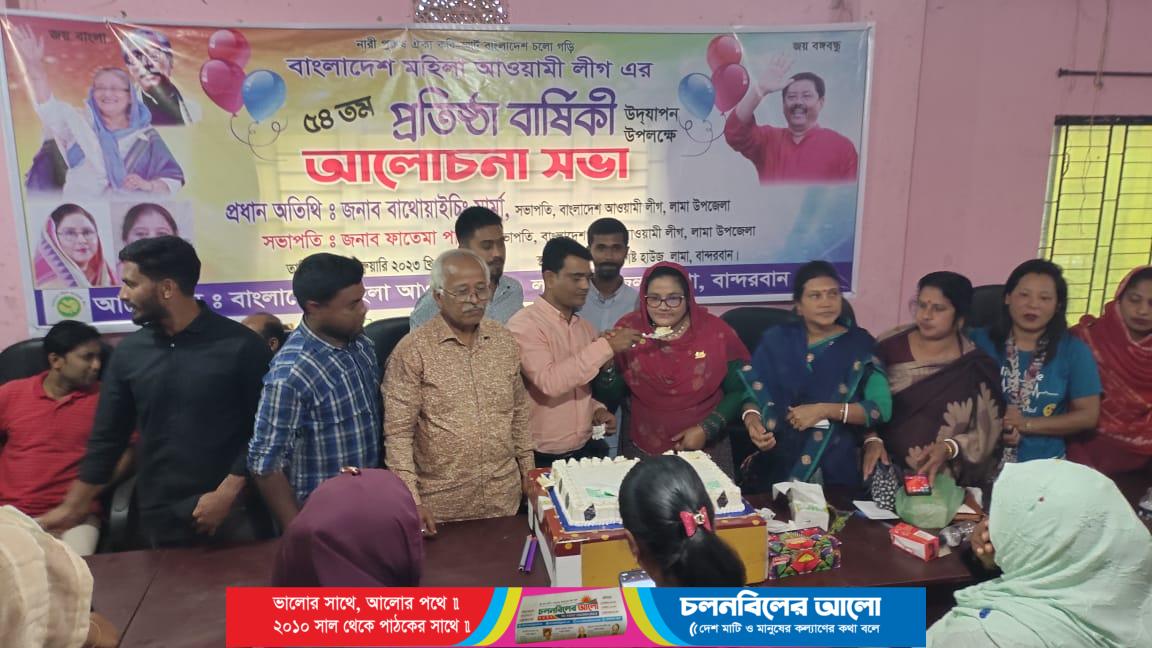 বাংলাদেশ মহিলা আওয়ামী লীগের এর ৫৪তম প্রতিষ্ঠা বার্ষিকী উদযাপন উপলক্ষে আলোচনা সভা অনুষ্ঠিত হয়েছে। সোমবার (২৭ ফেব্রুয়ারী) বিকাল ৩টায় লামা উপজেলা মহিলা আ, লীগের উদ্যোগে লামা বাজারস্থ জেলা পরিষদ গেষ্ট হাউজ এর (২য় তলায়) মিলনায়ন এ প্রধান অতিথি হিসেবে উপস্থিত ছিলেন লামা উপজেলা আওয়ামী লীগের সভাপতি ও ইউপি চেয়ারম্যান বাথোয়াইচিং মার্মা।