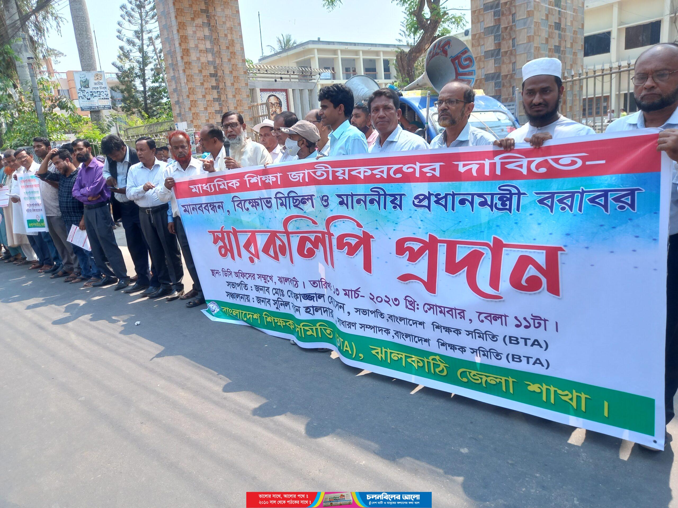 ঝালকাঠিতে বেসরকারী শিক্ষা জাতীয়করণসহ বিভিন্ন দাবীতে মানববন্ধন ও স্মারকলিপি পেশ করেছে বাংলাদেশ শিক্ষক সমিতি (বিটিএ)। সোমবার (১৩ মার্চ) জেলা প্রশাসক কার্যলয়ের সামনে সংগঠনের জেলা সভাপতি মো: তোফাজ্জেল হোসেন এর সভাপতিত্বে বিভিন্ন দাবী বাস্তবায়নের জন্য ঘন্টাব্যাপি দীর্ঘ লাইনে মানববন্ধন শেষে জেলা প্রশাসক ফারাহ্ গুল নিঝুম এর মাধ্যমে গণপ্রজাতন্ত্রী বাংলাদেশ সরকারের মাননীয় প্রধানমন্ত্রীর নিকট স্মারকলিপি প্রদান করেন সমিতির নেতৃবৃন্দ। এ সময় বক্তব্য রাখেন সংগঠনের জেলা শাখার সাধারণ সম্পাদক সুনীল বরণ হালদার, পাওতা মাধ্যমিক বিদ্যালয়ের প্রধান শিক্ষক মো: ফারুক হোসেন, আফছার মেমোরিয়াল মাধ্যমিক বিদ্যালয়ের প্রধান শিক্ষক মো: ফারুক হোসেন, রাজাপুর আঙ্গারিয়া মাধ্যমিক বিদ্যালয়ের প্রধান শিক্ষক মো: মিজানুর রহমানসহ ৪টি উপজেলার শিক্ষক নেতৃবৃন্দ।