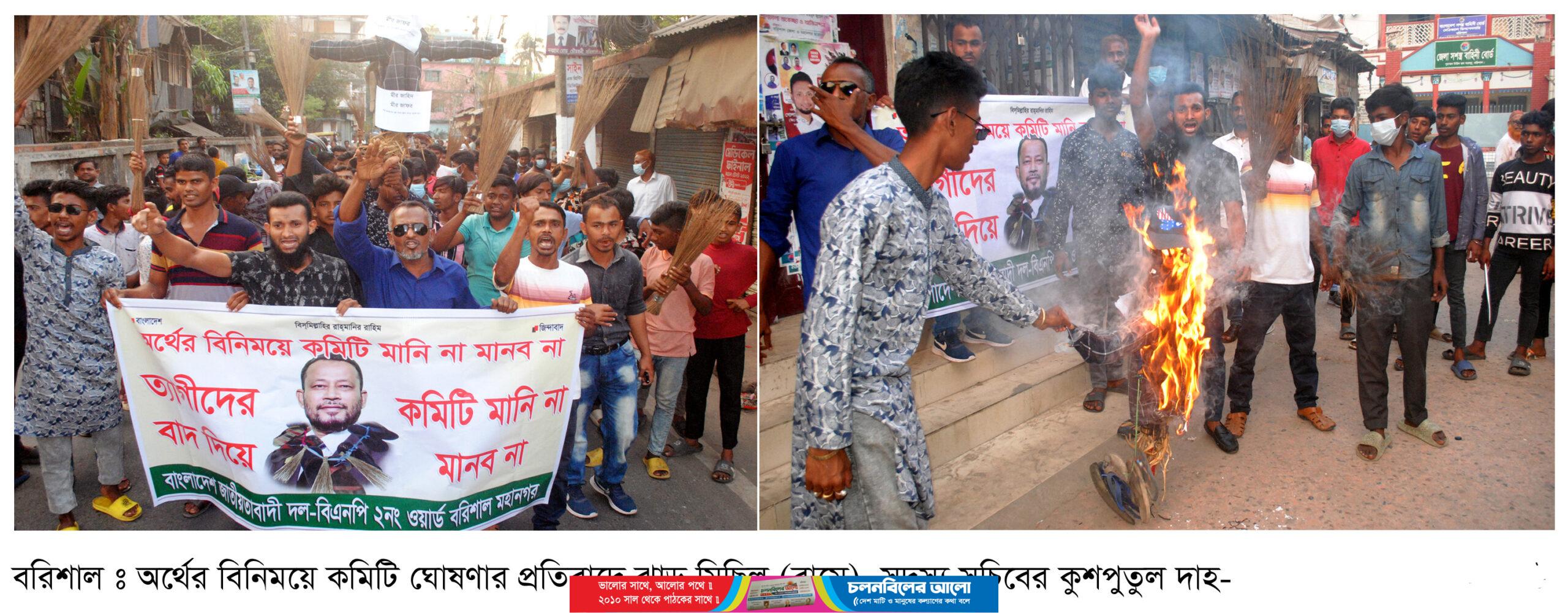 সোমবার সন্ধ্যায় নগরীর কাউনিয়া পানির ট্যাঙ্কির সামনে থেকে ওয়ার্ড বিএনপির নেতৃবৃন্দ ও ঘোষিত কমিটির সিনিয়র যুগ্ম আহবায়ক হানিফুল ইসলাম সুমন, রফিকুল ইসলাম, পরিমল, জামাল উদ্দিন ও সাদ্দামের নেতৃত্বে ঝাড়ুমিছিল বের করা হয়। ত্যাগী নেতাকর্মীদের বাদ দিয়ে মোটা অংকের টাকার বিনিময়ে নিস্কৃয়দের নিয়ে কমিটি ঘোষণার প্রতিবাদে বিক্ষোভ মিছিলটি নগরীর বিভিন্ন সড়ক প্রদক্ষিণ করে। পরে সদররোডস্থ জেলা ও মহানগর বিএনপির দলীয় কার্যালয়ের সামনে বিক্ষুব্ধরা প্রতিবাদ সভা করেন। এসময় মহানগর বিএনপির সদস্য সচিব মীর জাহিদুল কবিরের কুশপুতুল দাহ করা হয়।