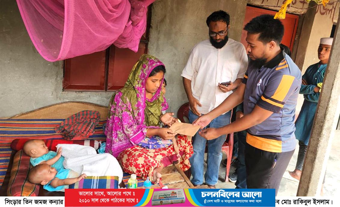 বুধবার দুপুর ১২টায় পৌর পাড়ার ভাড়া বাসায় তিন জমজ কন্যার মা সুমি আক্তারের হাতে নগদ ৫ হাজার টাকা তুলে দেন প্রতিমন্ত্রী পলকের সহকারি একান্ত সচিব মোঃ রাকিবুল ইসলাম।