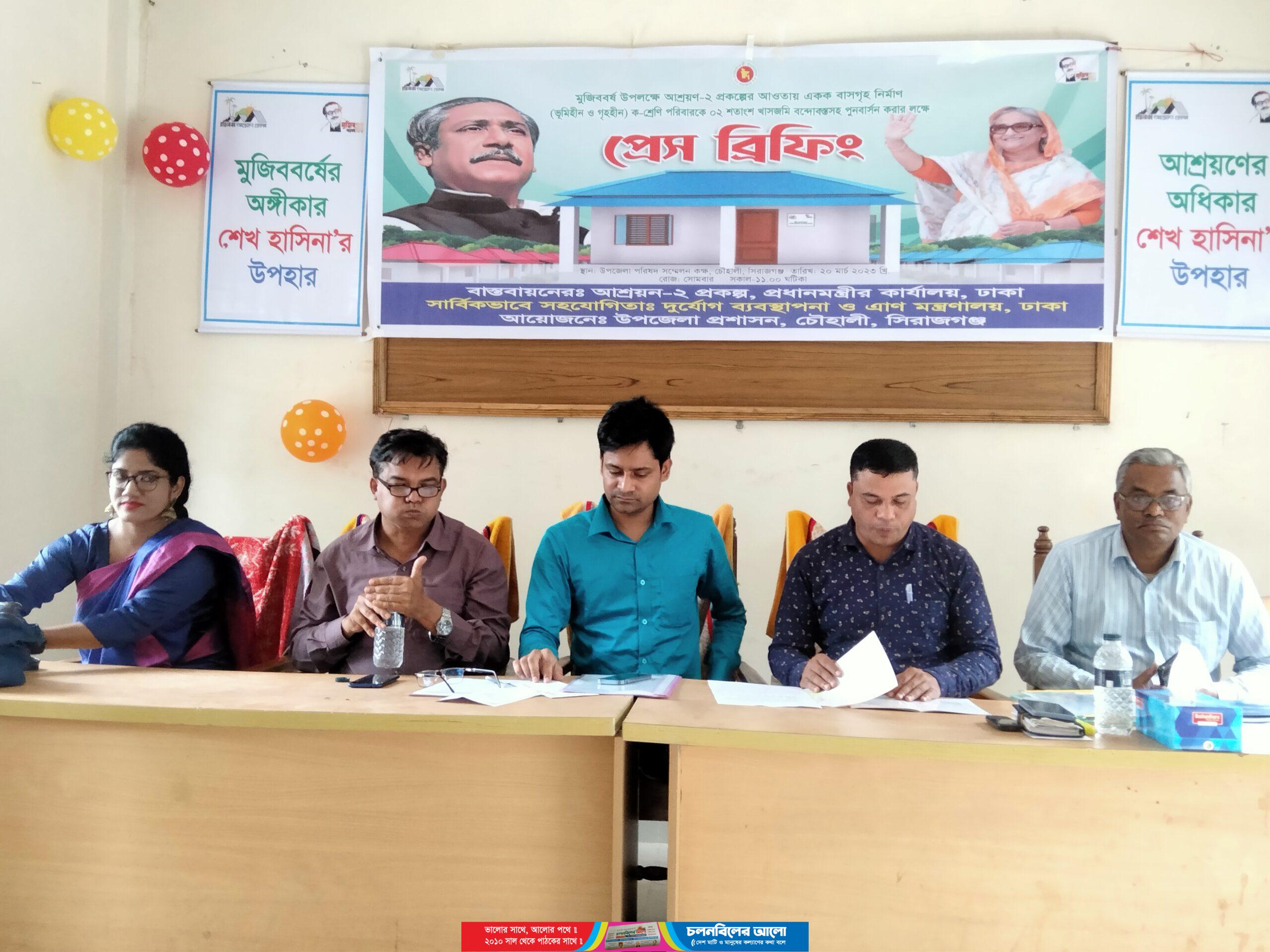প্রধানমন্ত্রী শেখ হাসিনার কার্যালয়ের বাস্তবায়নে, দুর্যোগ ব্যবস্থপনা ত্রাণ মন্রানালয়ের সহযোগিতায় ও চৌহালী উপজেলা প্রশাসনের আয়োজনে আশ্রয়ণ প্রকল্প ২ এর আওতায় বাসগৃহ নির্মাণ ও পুর্ণবাসন উপলক্ষে সিরাজগঞ্জের চৌহালীতে উপজেলা প্রশাসন সাংবাদিকদের সঙ্গে প্রেস ব্রিফিং অনুষ্ঠিত হয়েছে।