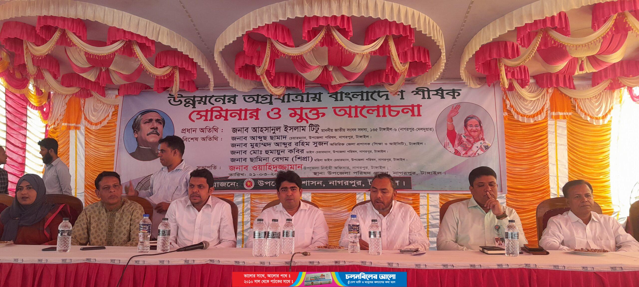 বর্তমান সরকারের উন্নয়ন জনসাধারনের মধ্যে পৌছে দেয়ার লক্ষে টাঙ্গাইলের নাগরপুর উপজেলায় উন্নয়নে অগ্রযাত্রায় বাংলাদেশ শীর্ষক সেমিনার, মুক্ত প্রতিযোগিতা ও আলোচনা সভা অনুষ্ঠিত হয়েছে।