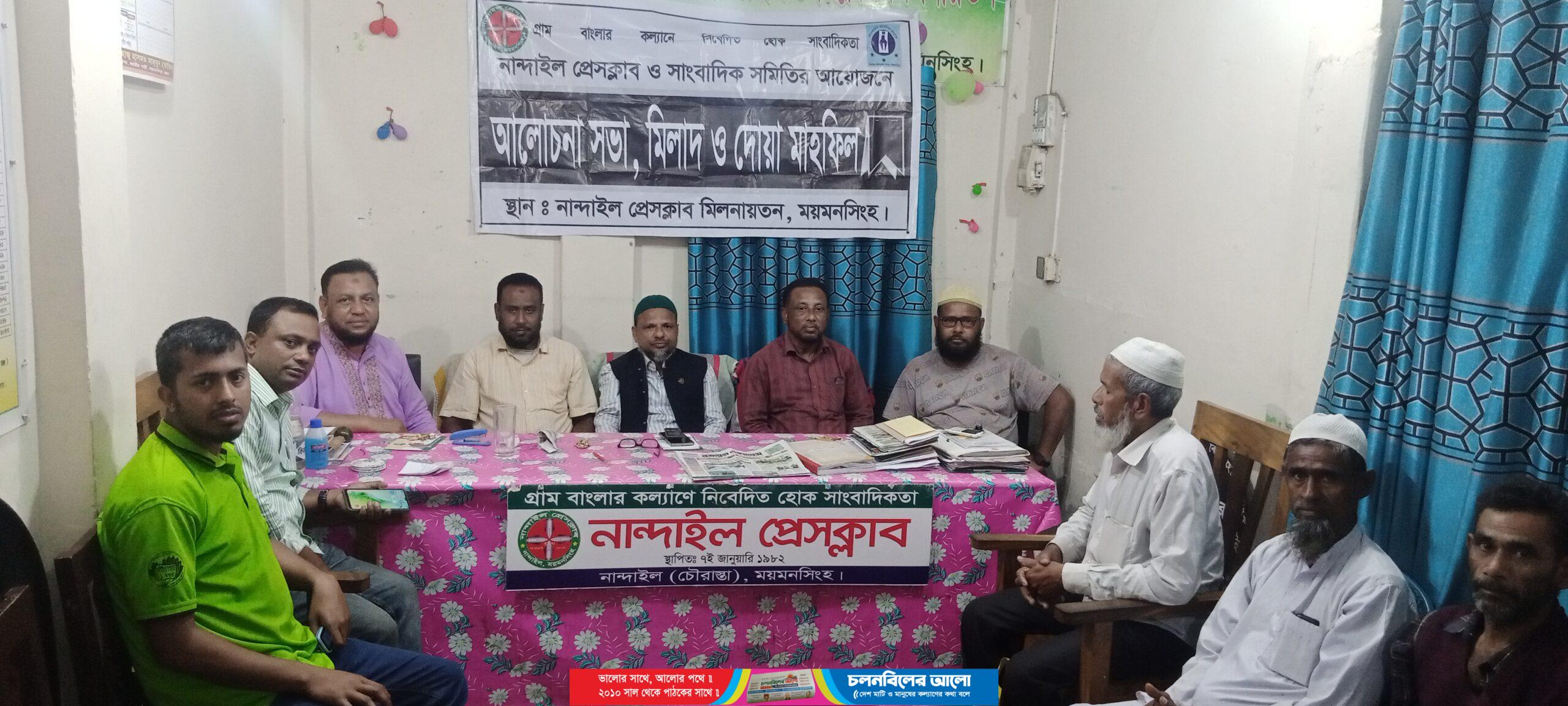 বৃহত্তর ময়মনসিংহের তথা নান্দাইলের কৃতি সন্তান, সাবেক ময়মনসিংহ জেলার গর্ভনর ও নান্দাইল আসনের সাবেক মাননীয় সংসদ সদস্য জননেতা মরহুম রফিক উদ্দিন ভূইঁয়ার ২৭তম মৃত্যুবার্ষিকী উপলক্ষে ২৩ শে মার্চ নান্দাইল প্রেসক্লাব মিলনায়তনে আলোচনা সভা ও দোয়া মাহফিলের আয়োজন করা হয়েছে। প্রেসক্লাবের সভাপতি এনামুল হক বাবুলের সভাপতিত্বে ও সাংবাদিক সমিতির সভাপতি এবি সিদ্দিক খসরু’র সঞ্চালনায় আলোচনায় অংশ গ্রহন করেন নান্দাইল উপজেলা প্রাথমিক শিক্ষক সমিতির সভাপতি আমিনুল ইসলাম আনজু, উপজেলা মানবাধিকার কমিশন নান্দাইল উপজেলা শাখার সহ-সভাপতি ডাঃ ফখর উদ্দিন ভূইঁয়া, রাজগাতী ইউনিয়ন আওয়ামীলীগ নেতা ডাঃ শফিকুল ইসলাম খোকন,সাংবাদিক সমিতির সহ সভাপতি ডাঃমনজুরুল হক, প্রেসক্লাবের অর্থ সম্পাদক ও সিএনএন বাংলা টিভির স্টাফ রিপোর্টার রফিকুল ইসলাম মোড়ল, সাহিত্য ও পাঠাগার সম্পাদক ভোরের কাগজ পত্রিকার প্রতিনিধি শফিকুল ইসলাম শফিক, দপ্তর সম্পাদক ও দৈনিক প্রতিদিনের সংবাদ পত্রিকার প্রতিনিধি মো. রমজান আলী, প্রচার ও প্রকাশনা সম্পাদক ও দৈনিক সময়ের কাগজ পত্রিকার প্রতিনিধি ফরিদ মিয়া প্রমুখ। আলোচনা সভা শেষে মরহুম জননেতা রফিক উদ্দিন ভূইঁয়ার বিদেহী আত্মার মাগফিরাত কামনা করে বিশেষ দোয়া অনুষ্ঠিত হয়।