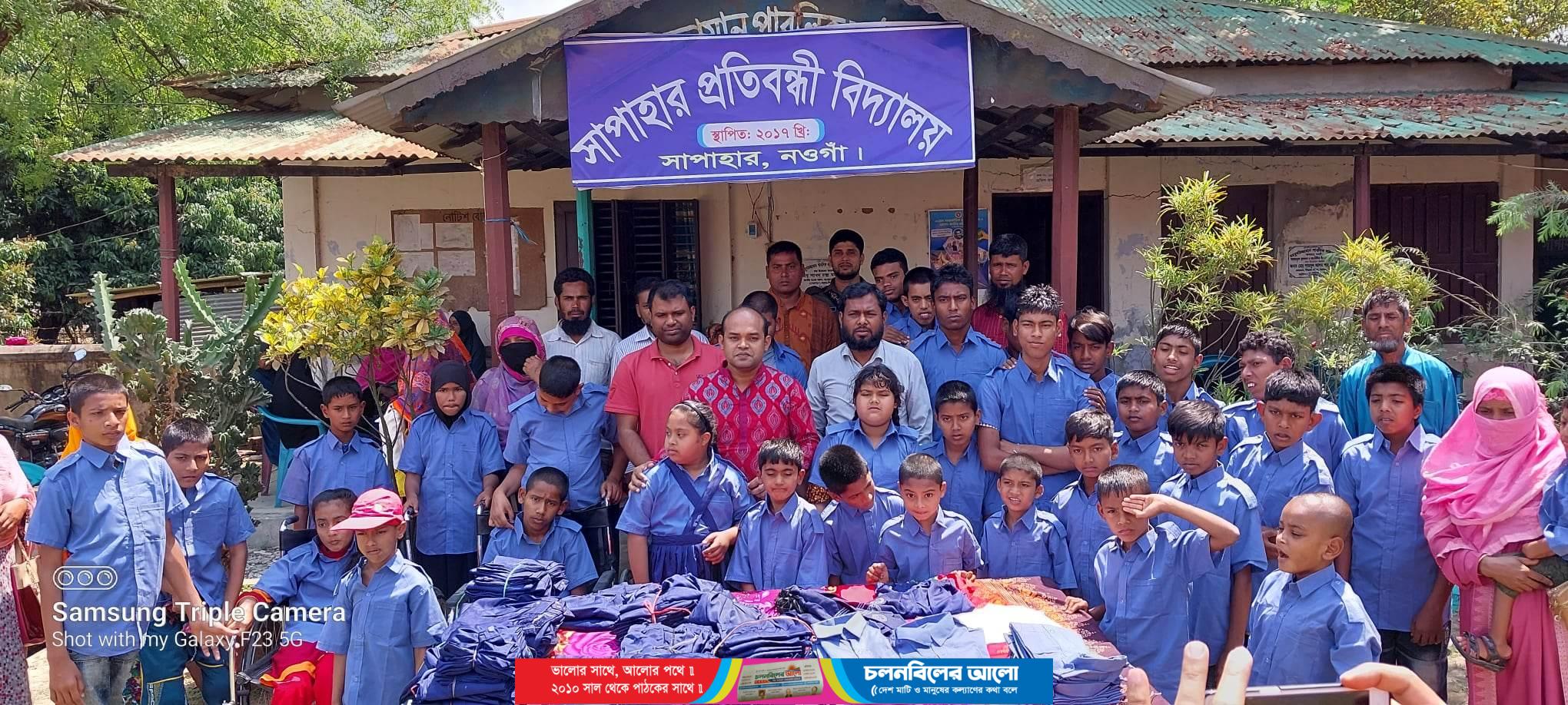 নওগাঁর সাপাহারে প্রতিবন্ধী বিদ্যালয়ের সকল শিক্ষার্থীদের মাঝে উপজেলা নির্বাহী অফিসার (ইউএনও) আব্দুল্যাহ আল মামুন স্কুল ইউনিফর্ম  উপহার হিসেবে প্রদান করেছে।