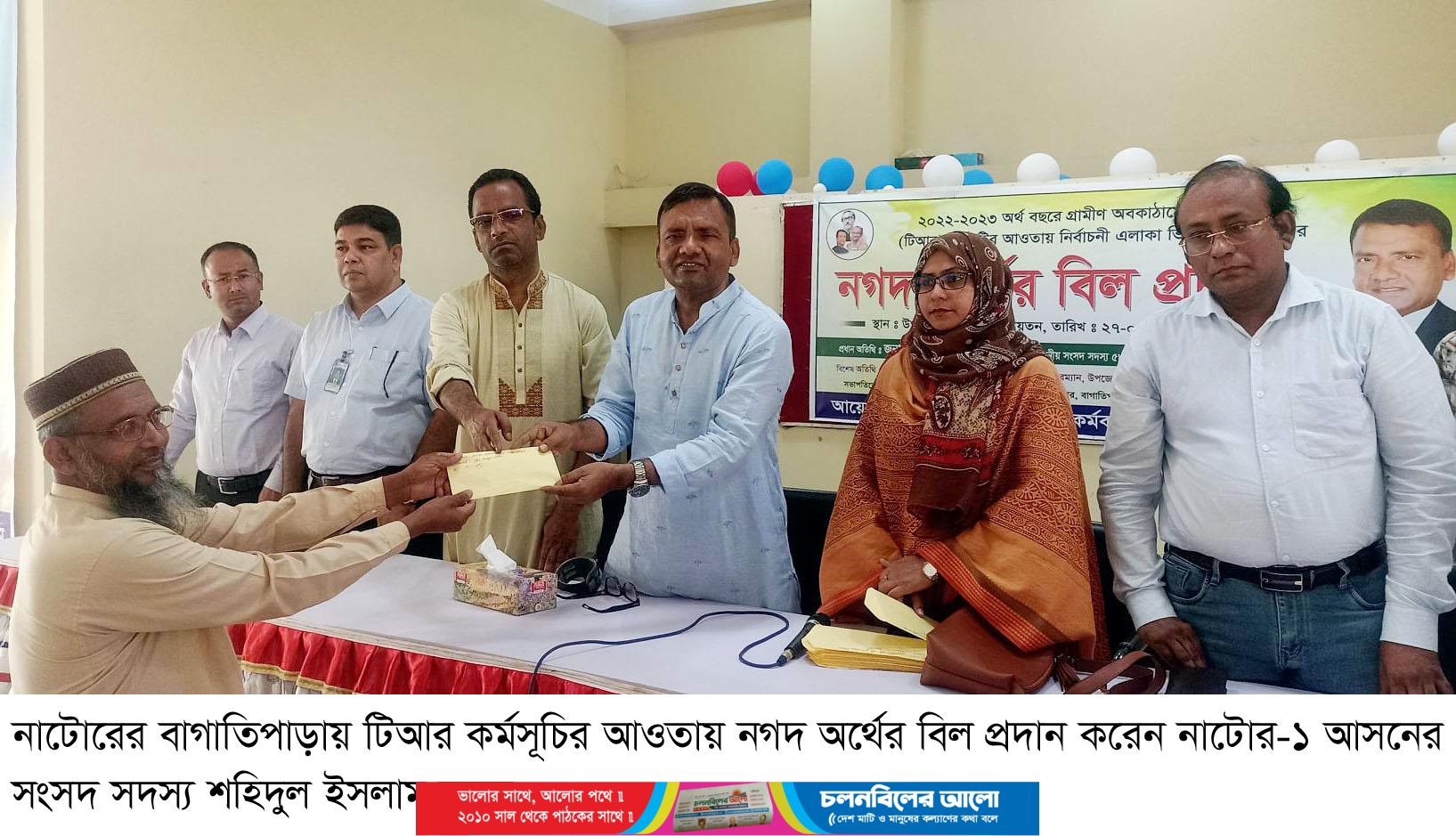 নাটোরের বাগাতিপাড়ায় ২০২২-২৩ অর্থ বছরে গ্রামীণ অবকাঠামো রক্ষণাবেক্ষণ (টিআর) কর্মসূচির আওতায় নির্বাচনী এলাকা ভিত্তিক প্রথম পর্যায়ে নগদ অর্থের বিল প্রদান করা হয়েছে। সোমবার সকালে উপজেলা পরিষদ মিলনায়তনে উপজেলা প্রকল্প বাস্তবায়ন কর্মকর্তার কার্যালয়ের আয়োজনে এসব বিতরণ করা হয়।