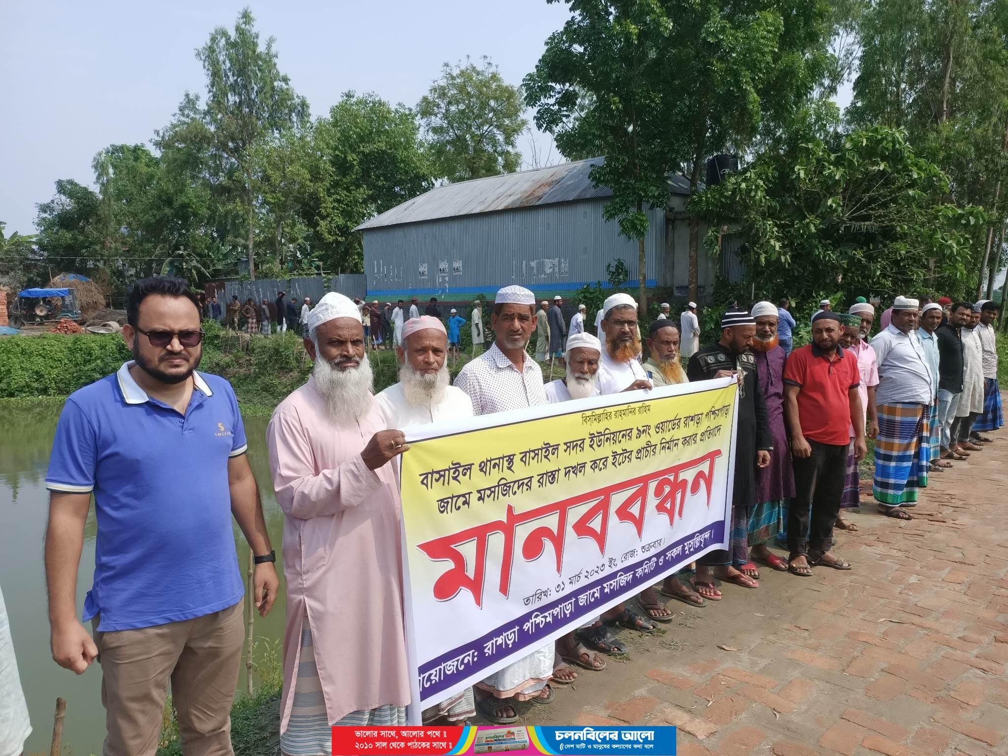 টাঙ্গাইলের বাসাইল উপজেলার রাশড়া পশ্চিমপাড়া জামে মসজিদের রাস্তা দখল করে প্রাচীর নির্মাণের প্রতিবাদে মানববন্ধন করেছে এলাকাবাসী। শুক্রবার (৩১ মার্চ) জুমআ’র নামাজ শেষে এলাকাবাসীর উদ্যোগে এ মানববন্ধনের আয়োজন করা হয়।