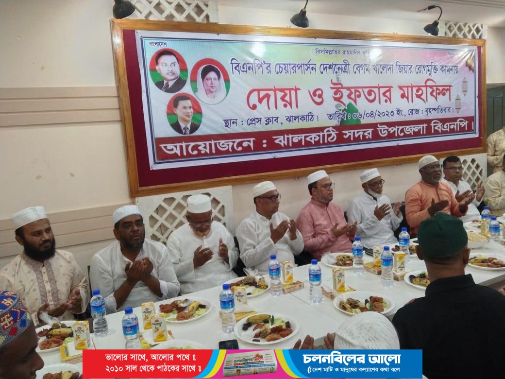 বিএনপি’র চেয়ারপার্সন দেশনেত্রী বেগম খালেদা জিয়ার রোগমুক্তি কামনায় ঝালকাঠি সদর উপজেলা বিএনপি’র আয়োজনে দোয়া ও ইফতার মাহফিল অনুষ্ঠিত হয়েছে। এতে সভাপতিত্ব করেন সদর উপজেলা বিএনপি’র সভাপতি অধ্যাপক এজাজ আহমেদ। প্রধান অতিথি ছিলেন জেলা বিএনপি’র আহ্বায়ক এড. সৈয়দ হোসেন। প্রধানবক্তা হিসেবে বক্তব্য রাখেন জেলা বিএনপি’র সদস্য সচিব এড. মো: শাহাদাৎ হোসেন। বিশেষ অতিথি হিসেবে বক্তব্য রাখেন জেলা আহ্বায়ক কমিটির অন্যতম সদস্য এড. মিজানুর রহমান মুবিন, পৌর বিএনপি’র সভাপতি এড. মো: নাসিমুল হাসান, কৃষকদলের সাধারণ সম্পাদক চাষী মো: নান্না খলিফা, যুবদলের সাধারণ সম্পাদক এড. আনিচুর রহমান খান, স্বেচ্ছাসেবক দলের সাধারণ সম্পাদক সরদার মো: শাফায়েত হোসেন, তাঁতীদলের সভাপতি মো: বাচ্চু হাসান, ছাত্রদলের সাধারণ সম্পাদক গিয়াস সরদার দীপু প্রমুখ।এসময় অন্যান্যের মধ্যে উপস্থিত ছিলেন বিএনপি ও অঙ্গ ও সহযোগী সংগঠনের সদস্যবৃন্দ।