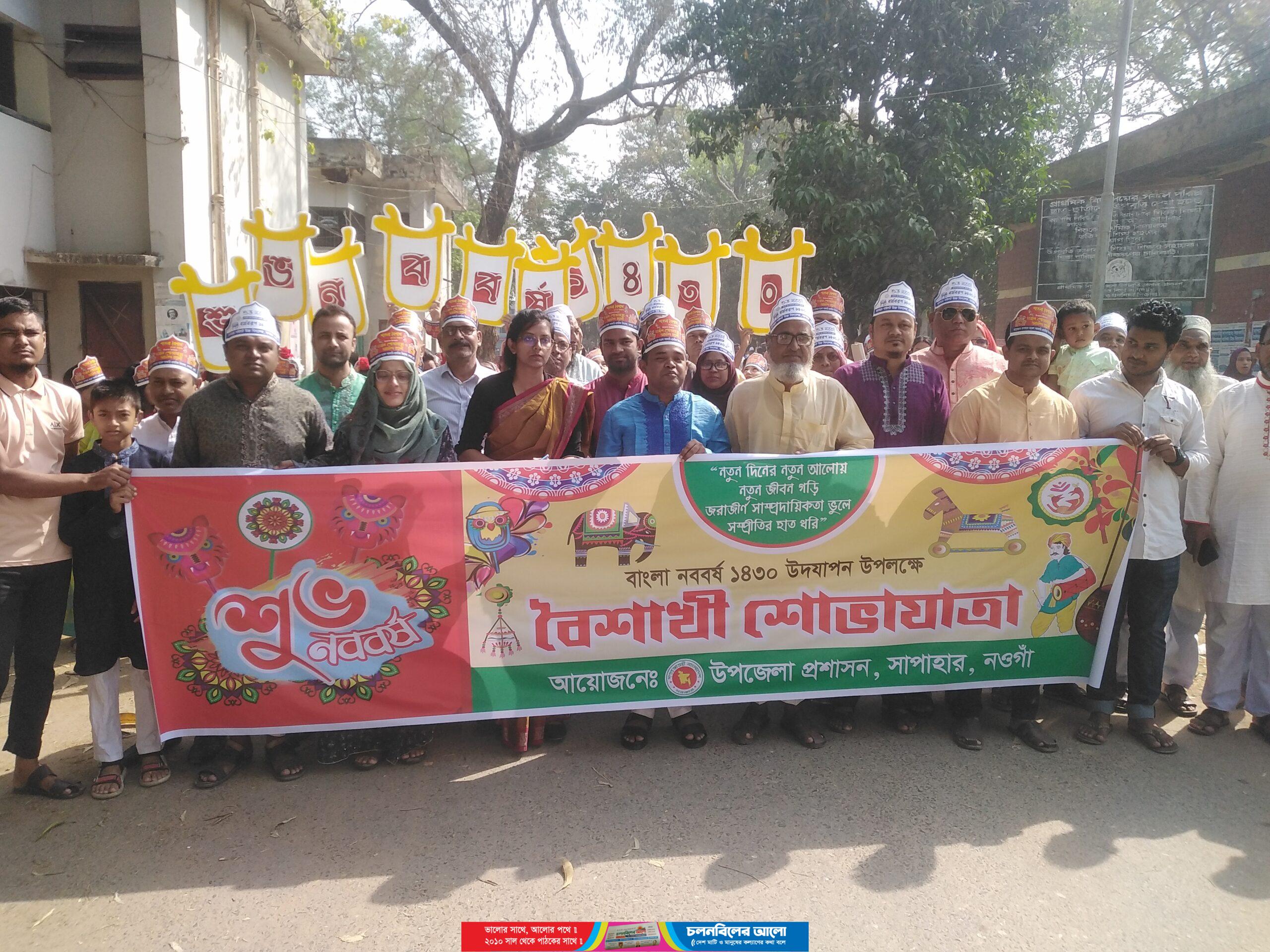 নওগাঁর সাপাহারে বাংলা নববর্ষ ১৪৩০ উদযাপনের অংশ হিসেবে নতুন বছরকে বরণ করে নেওয়া উপলক্ষে মঙ্গল শোভাযাত্রা অনুষ্ঠিত হয়েছে । পহেলা বৈশাখ শুক্রবার সকাল ৯ টার সময় উপজেলা প্রশাসন কর্তৃক আয়োজিত মঙ্গল শোভাযাত্রায় উপজেলা নির্বাহী অফিসার আব্দুল্যাহ আল মামুন এর সভাপতিত্ব ও নেতৃত্বে উপজেলা বিভিন্ন দপ্তরের কর্মকর্তা-কর্মচারী, বিভিন্ন শিক্ষা প্রতিষ্ঠানের শিক্ষক-শিক্ষিকা ছাত্র-ছাত্রীবৃন্দ ও সাংবাদিকগণ উপস্থিত ছিলেন।