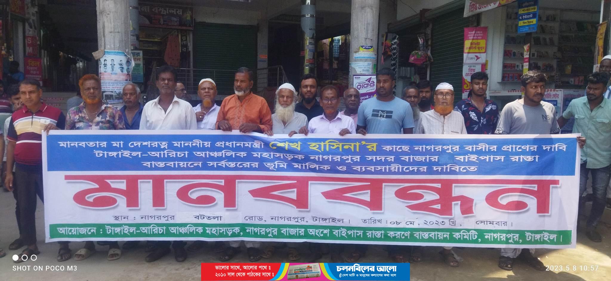 সোমবার(৮ মে ২০২৩)সকাল ১১.০০ টায় নাগরপুর সরকারী কলেজ গেট সংলগ্ন রাজিয়া শপিং কমপ্লেক্সে এর সামনে টাঙ্গাইল-নাগরপুর-আরিচা আঞ্চলিক মহাসড়ক নাগরপুর বাজার অংশে বাইপাসকরণ বাস্তবায়ন কমিটির আয়োজনে ঘন্টাব্যাপী এ মানববন্ধন অনুষ্ঠিত হয়।
