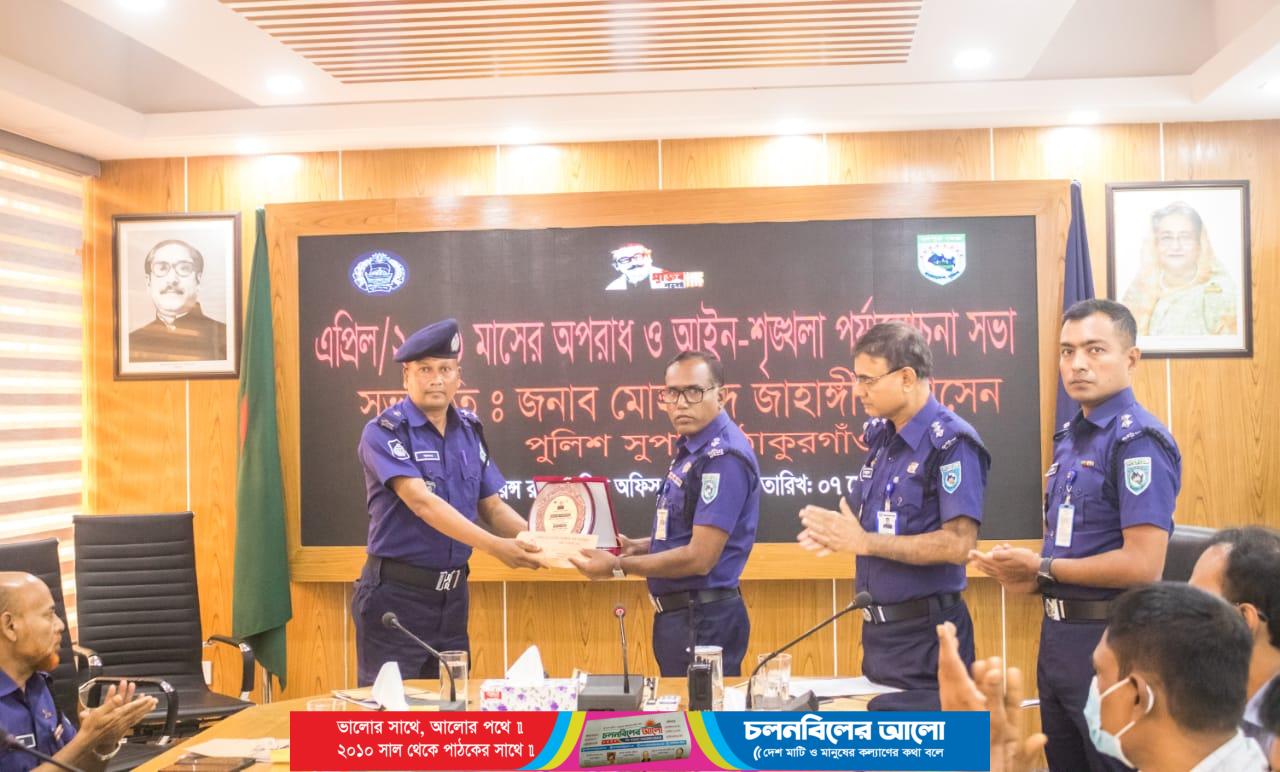 রবিবার ৭ মে দুপুরে ঠাকুরগাঁও জেলা পুলিশ সুপার কার্যালয়ের অফিস সম্মেলন কক্ষে মাসিক কল্যান ও অপরাধ সভায় ২০২৩সালের মাদক উদ্ধার, আইন-শৃঙ্খলা ও অপরাধ নিয়ন্ত্রন সহ সকল বিষয় বিবেচনায় জেলার শ্রেষ্ঠ অফিসার হিসেবে ঘোষণা দিয়ে ক্রেস্ট প্রদান করেন ঠাকুরগাঁও পুলিশ সুপার মোহাম্মদ জাহাঙ্গীর হোসেন ।