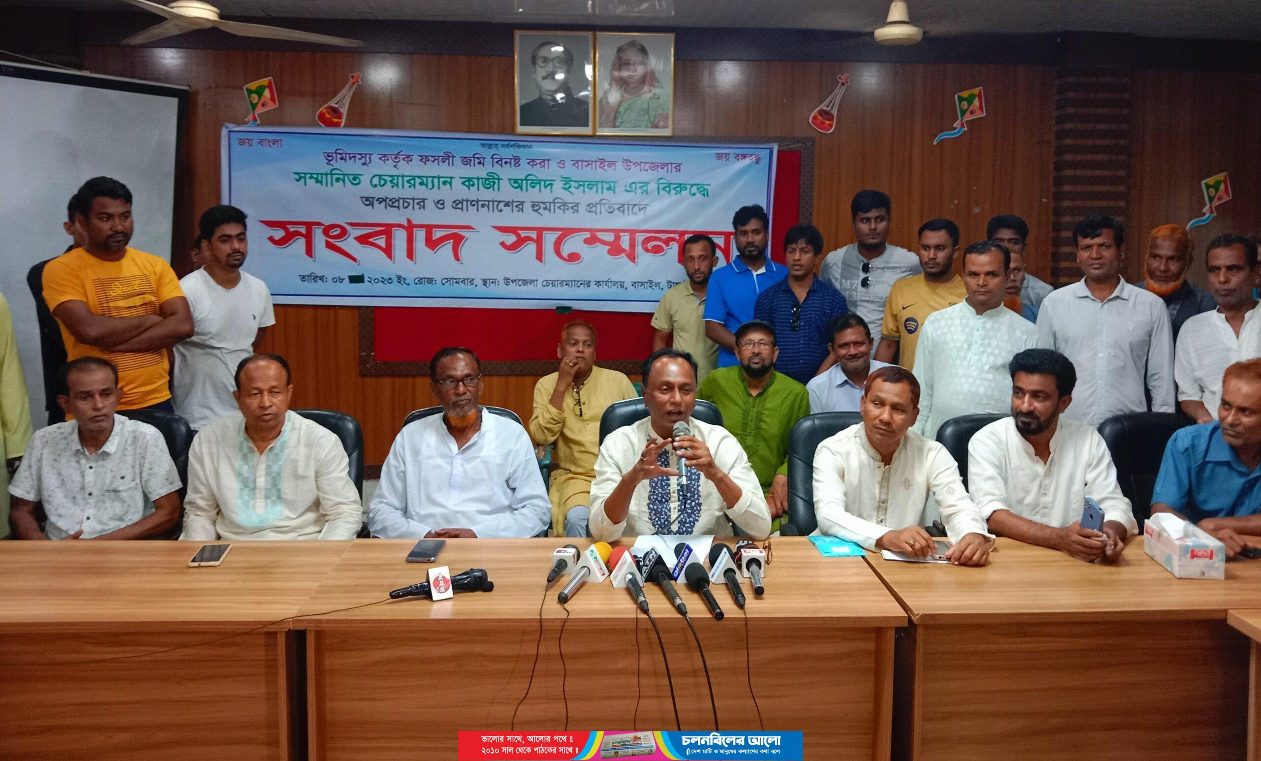সংবাদ সম্মেলনে জানানো হয়, উপজেলার কাশিলে ভূমিদস্যু ও বালু খেকো বিএনপি নেতা কাজী বাদল তার লোক দিয়ে গত ৪ মে উপজেলা পরিষদের চেয়ারম্যান কাজী অলিদ ইসলামের বিরুদ্ধে সংবাদ সম্মেলন করেন। সেখানে কাজী অলিদের বিরুদ্ধে আর্থিক লেনদেনের অপপ্রচার চালানো হয়। এছাড়াও তাকে হত্যার হুমকিও দেওয়া হয়। রহস্যজনক কারণে আওয়ামী লীগের শীর্ষপর্যায়ে একটি গ্রæপ সহযোগিতা করায় বিএনপি নেতা কাজী বাদল শক্ত অবস্থানে রয়েছে। কাজী বাদল শক্ত অবস্থানে থাকায় প্রাণনাশের হুমকির পর থেকে কাজী অলিদ ইসলাম আতঙ্কে রয়েছেন। তিন ফসলি জমি বিনষ্ট করে ‘লেক ভিউ’ নামীয় একটি ভুয়া প্রজেক্টের বিরোধিতা করায় তার উপর হামলা হলে আওয়ামী লীগের শীর্ষপর্যায়েরসহ পাঁচজনকে দায়ী করবেন বলে সংবাদ সম্মেলনে জানান।