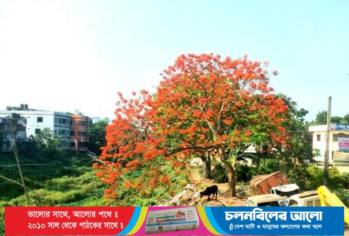 প্রকৃতির যে দিকে তাকানো যায় গাছের সবুজ পাতা অড়াল করে দৃষ্টি কাড়ে কৃষ্ণচূড়ার লাল রঙ। টাঙ্গাইলের গোপালপুরে বৈরান নদীর তীরে গোপালপুর পৌরসভার সামনে রাস্তায় পাশে কৃষ্ণচূড়া গাছটিতে আনাচে কানাচে ছেয়ে গেছে লাল-হলুদ রঙের কৃষ্ণচূড়া।