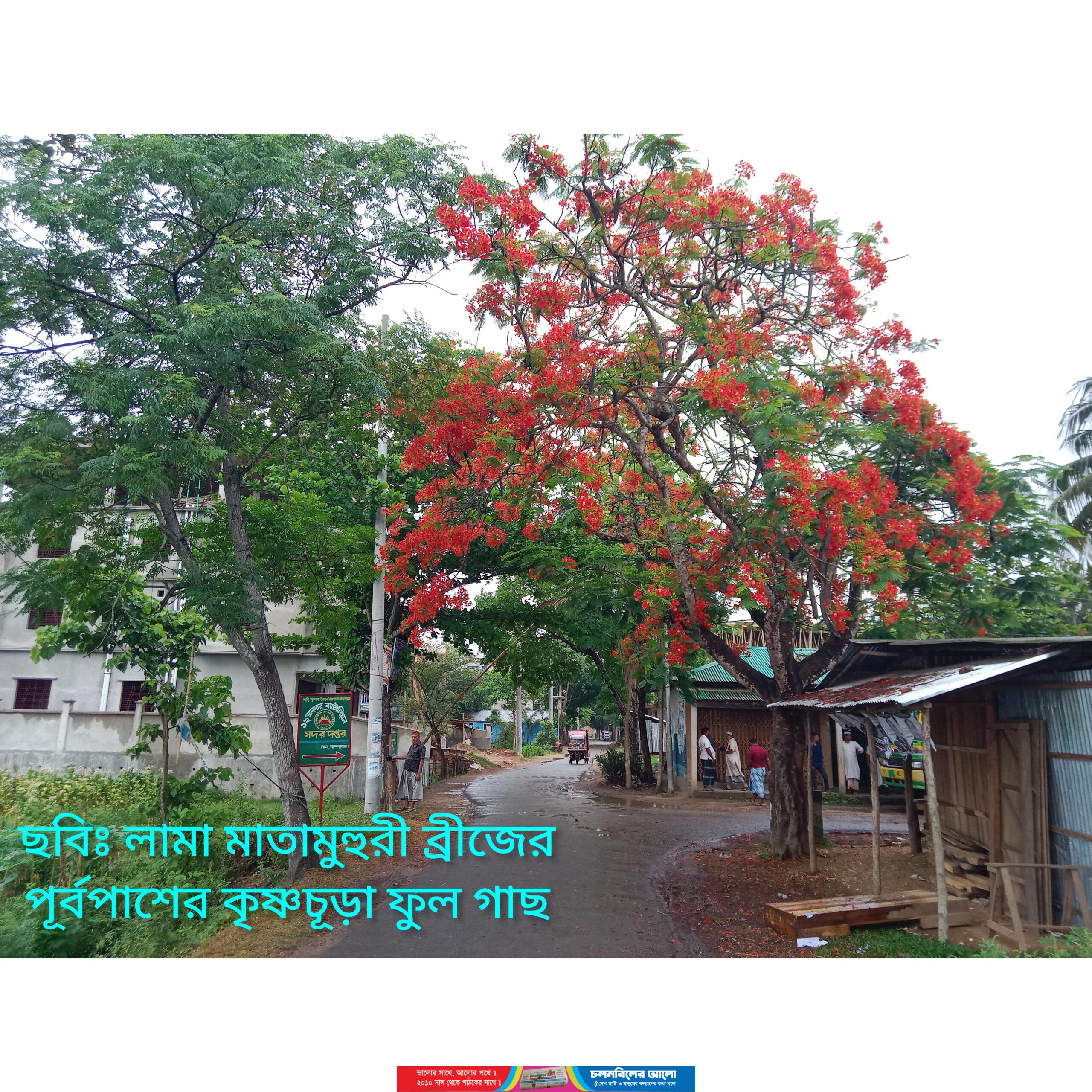 লামা উপজেলা পরিষদ,লামা হাইস্কুল,মাতামুহুরী ব্রিজের মোড়ে,টিটি এন্ড ডিসি,চম্পাতলীর আনসার ব্যাটালিয়নসহ রাস্তার পাশে ও অন্যান্য স্থানে দেখা মিলছে কৃষ্ণচূড়ার।