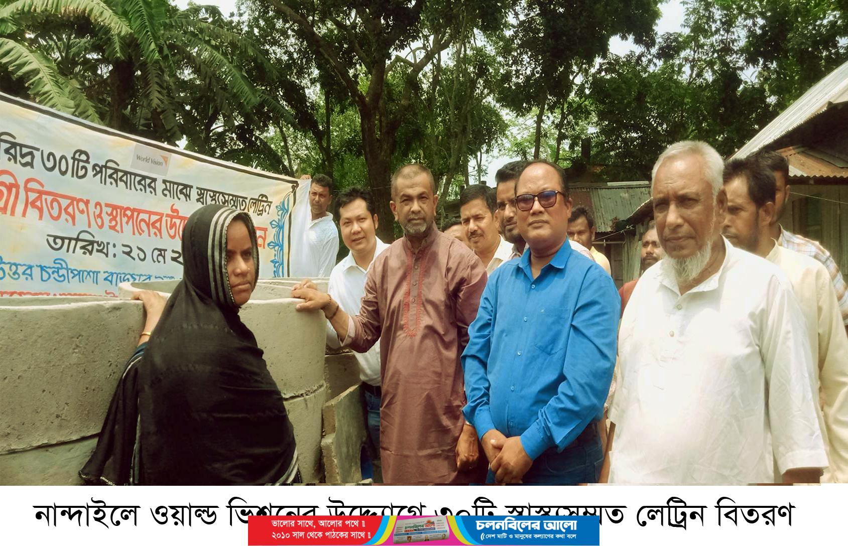 ময়মনসিংহের নান্দাইলে ওয়াল্ড ভিশন বাংলাদেশ নান্দাইল এপি’র উদ্দ্যোগে নান্দাইলে ৩০ হতদরিদ্র পরিবারের মাঝে রবিবার (২ মে) স্বাস্থ্য সম্মত লেট্রিন বিতরণ করা হয়েছে। উপজেলার চন্ডীপাশা বাজারে নান্দাইল এপি’র ম্যানেজার সুমন রোরামের সভাপতিত্বে ও জনি এস গমেজের সঞ্চালনায় প্রধান অতিথির বক্তব্য রাখেন নান্দাইল আসনের সংসদ সদস্য আলহাজ্ব আনোয়ারুল আবেদীন খান তুহিন ও বিশেষ অতিথি সিনিয়র ম্যানেজার নান্দাইল এপি’র এসিও প্রশান্ত নাফাক, নান্দাইল পৌর সভার ৯নং ওয়ার্ড কমিশনার ইদ্রিস আলী। এছাড়াও বক্তব্য রাখেন সাংবাদিক শাহজাহান ফকির, নান্দাইল এপি’র অংশ বিডিসি চন্ডীপাশা ইউনিয়নের ধূরুয়া ভিডিসির সাধারন সম্পাদক এইচএম মিজান, ঘোষপালা ভিডিসি’র সভাপতি বাছির উদ্দিন প্রমুখ।