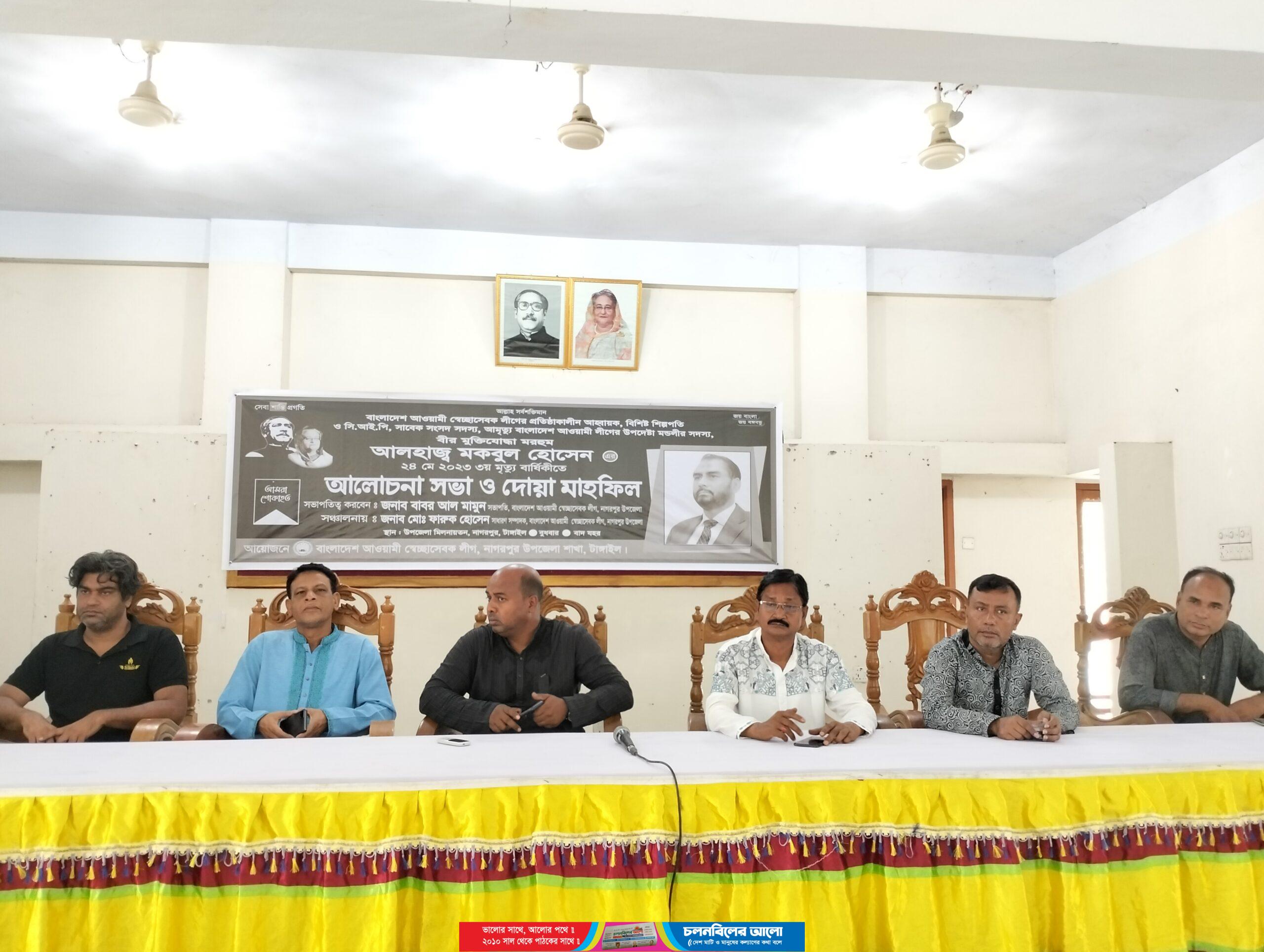 কেন্দ্রীয় সেচ্ছাসেবক লীগের প্রতিষ্ঠাকালীন আহবায়ক, বিশিষ্ট শিল্পপতি ও সি. আই. পি, সাবেক সংসদ সদস্য, আমৃত্যু বাংলাদেশ আওয়ামীলীগের উপদেষ্ঠা মন্ডলীর সদস্য, বীর মুক্তিযোদ্ধা মরহুম আলহাজ্ব মকবুল হোসেনের ৩য় মৃত্যু বাষিকী পালিত হয়েছে। বুধবার সকালে উপজেলা সেচ্ছাসেবক লীগের উদ্যোগে উপজেলা পরিষদ মিলনায়তনে দোয়া মাহফিল ও আলোচনা সভা অনুষ্ঠিত হয়।