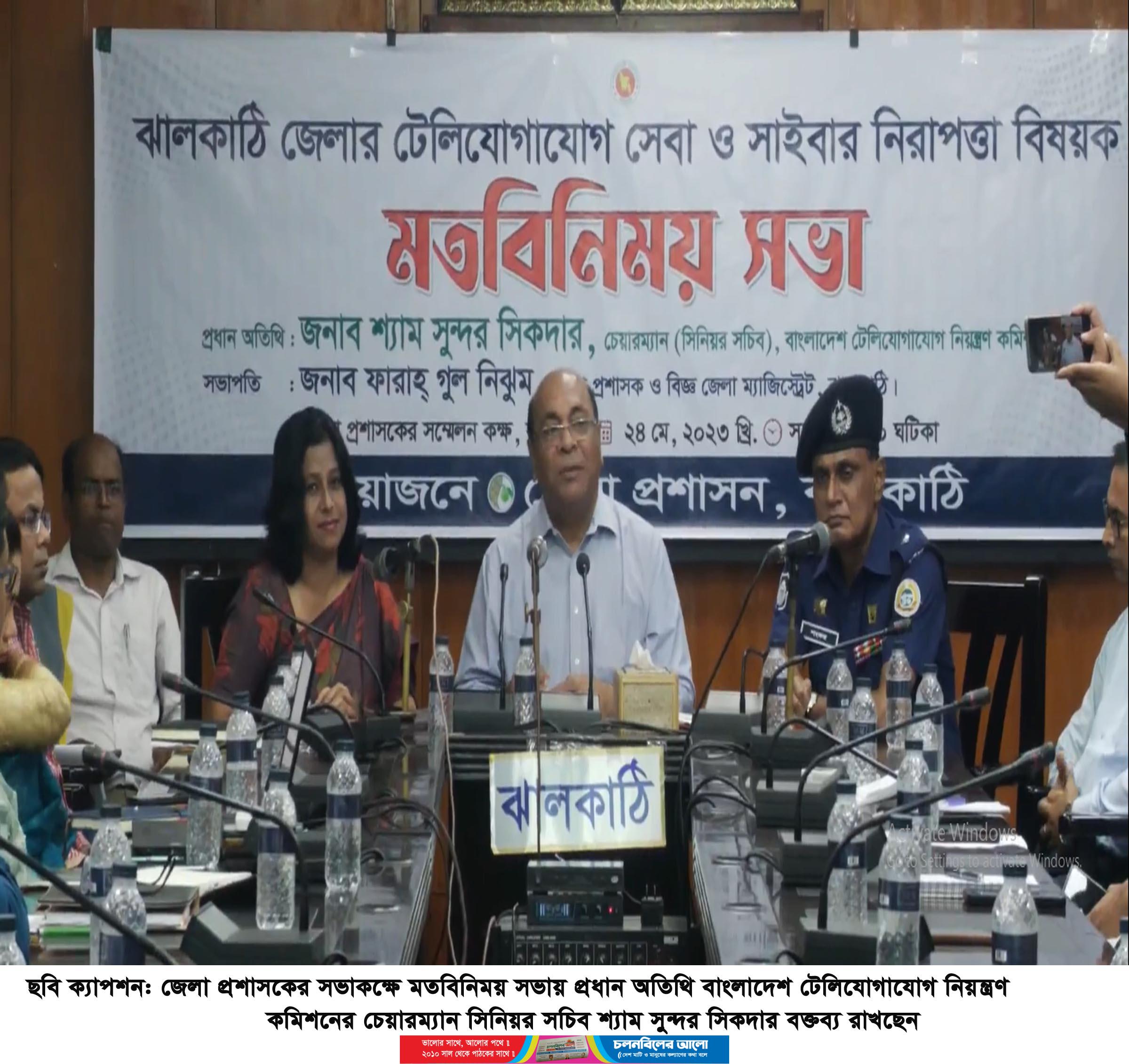 টেলিযোগাযোগ সেবা ও সাইবার নিরাপত্তা বিষয়ক মতবিনিময় সভা ঝালকাঠিতে অনুষ্ঠিত হয়েছে। বুধবার ২৪ মে সকালে জেলা প্রশাসকের সভাকক্ষে মতবিনিময় সভায় প্রধান অতিথি ছিলেন বাংলাদেশ টেলিযোগাযোগ নিয়ন্ত্রণ কমিশনের চেয়ারম্যান সিনিয়র সচিব শ্যাম সুন্দর সিকদার। জেলা প্রশাসক ফারাহ গুল নিঝুমের সভাপতিত্বে মোবাইল নেটওয়ার্ক ও ব্রডব্যান্ড কোম্পানির প্রতিনিধি, বিভিন্ন দফতরের কর্মকর্তা, শিক্ষক ও সুশীল সমাজের ব্যক্তিবর্গসহ বিভিন্ন পর্যায়ের শতাধিক প্রতিনিধিরা এতে অংশ নেয়। অনুষ্ঠানে প্রধান অতিথি সিনিয়র সচিব শ্যাম সুন্দর সিকদার বলেন, “ সাইবার নিরাপত্তা বিষয়ে টেলিযোগাযোগ নিয়ন্ত্রণ কর্তৃপক্ষ সকল বেসরকারী মুঠোফোন কোম্পানীগুলোকে সতর্কসহ বেসরকারী গ্রাহকের সেবা নিশ্চিত এবং সেবার মনোভাব নিয়ে কাজ করার পরামর্শ দেন। সরকারের টেলিযোগাযোগ খাতের সাফল্যে তুলে ধরে সাইবার ক্রাইম প্রতিরোধে বিভিন্ন পরামর্শ দেন। তিনি আরো বলেন, ইন্টারনেট ব্যবহারের সঠিক নিয়ম পদ্ধতি জানতে হবে। সরকার জনগনের স্বার্থে কাজ করছে যা জনগনের মাঝে তুরে ধরতে হবে।” আলোচনায় সভায় অতিরিক্ত জেলা প্রশাসক লতিফা জান্নাতী, উপজেলা নির্বাহী অফিসার সাবেকুন নাহার, সহকারী কমিশনার ও এক্সিকিউটিভ ম্যাজিষ্ট্রেট (নেজারত) মিলন চাকমা, অতিরিক্ত পুলিশ সুপার (ক্রাইম এন্ড অপস) শংকর কুমার দাস ও ইলেট্রনিক্স এন্ড প্রিন্ট মিডিয়ার সাংবাদিকগণসহ আরো অনেকে উপস্থিত ছিলেন।