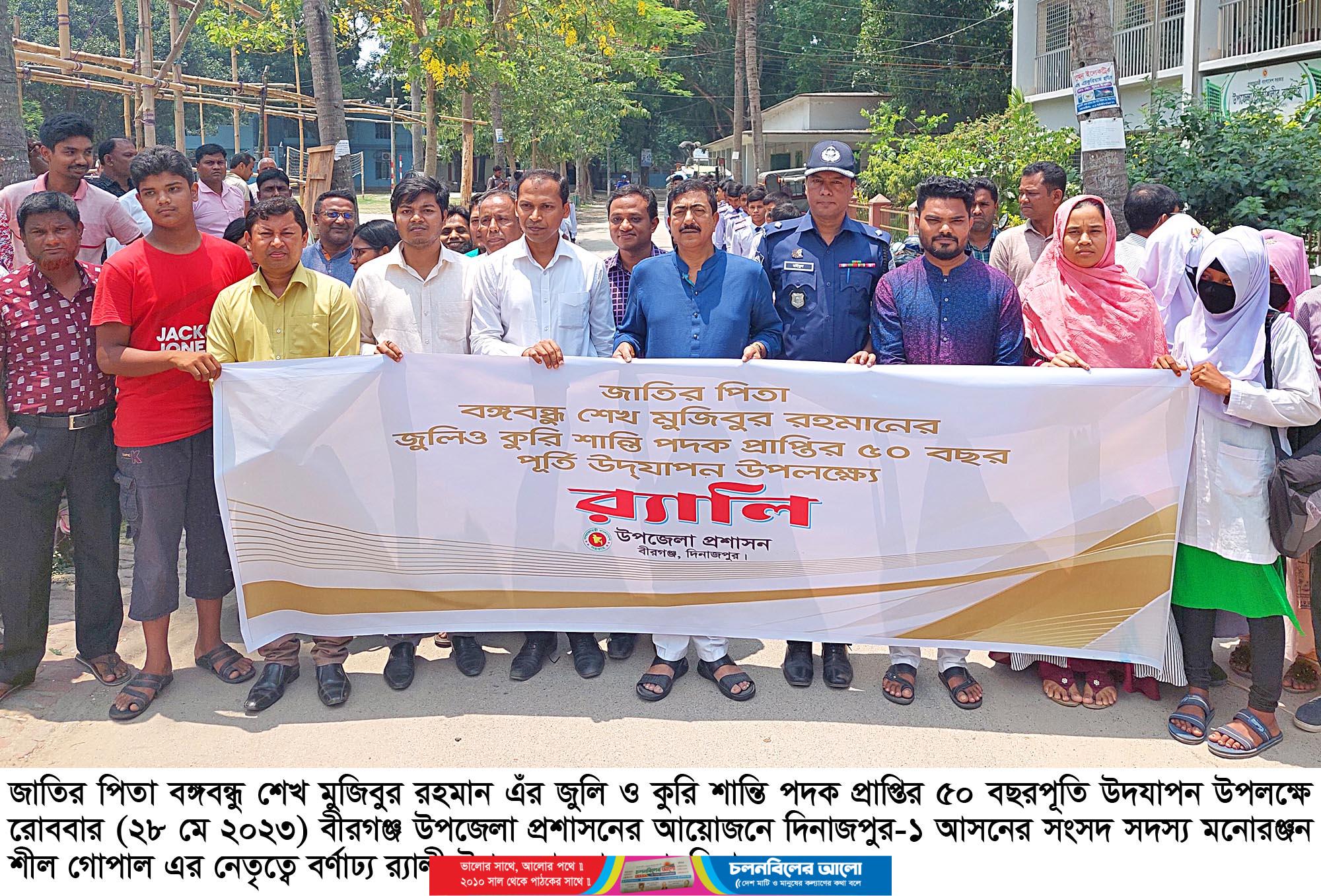 জাতির পিতা বঙ্গবন্ধু শেখ মুজিবুর রহমান এঁর জুলি ও কুরি শান্তি পদক প্রাপ্তির ৫০বছরপূতি উদযাপন উপলক্ষে রবিবার (২৮ মে ২০২৩) দিনাজপুরের বীরগঞ্জ উপজেলা পরিষদ হলরুমে উপজেলা প্রশাসনের আয়োজনে আলোচনা সভায় প্রধান অতিথির বক্তব্যে তিনি এসব কথা বলেন। এর আগে মনোরঞ্জন শীল গোপাল এমপি’র নেতৃত্বে বর্ণাঢ্য র‌্যালী উপজেলার শহর প্রদক্ষিণ করে।