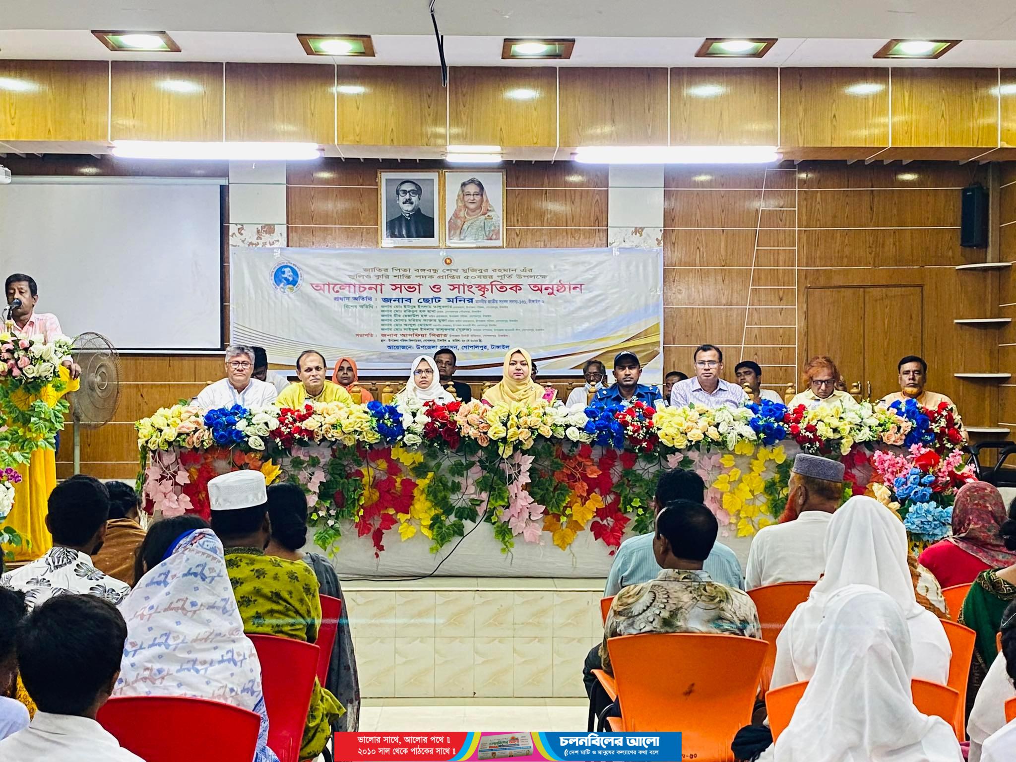 জাতির পিতা বঙ্গবন্ধু শেখ মুজিবুর রহমানের ‘জুলিও কুরি শান্তি পদক’ প্রাপ্তির ৫০ বছর পূর্তি উপলক্ষে টাঙ্গাইলের গোপালপুরে আলোচনা সভা ও সাংস্কৃতিক অনুষ্ঠান অনুষ্ঠিত হয়। উক্ত আলোচনা সভায় বক্তারা বঙ্গবন্ধুর আত্মজীবনী ও বঙ্গবন্ধু শেখ মুজিবুর রহমানের ‘জুলিও কুরি শান্তি পদক সম্পর্কিত বিষয় নিয়ে বিভিন্ন বিষয়বস্তু তুলে ধরেন।