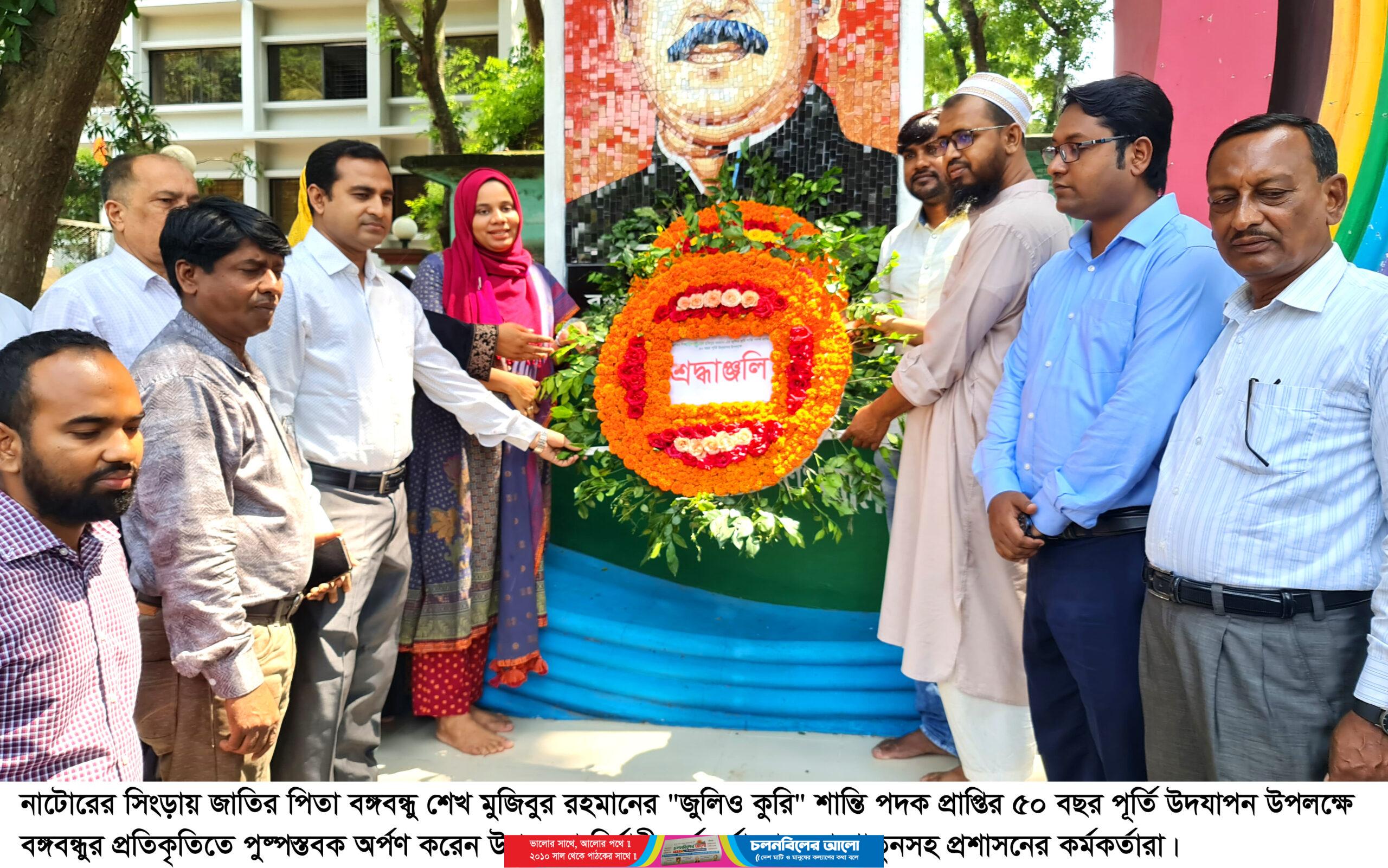 নাটোরের সিংড়ায় জাতির পিতা বঙ্গবন্ধু শেখ মুজিবুর রহমানের ‘জুলিও কুরি’ শান্তি পদক প্রাপ্তির ৫০ বছর পূর্তি উদযাপিত হয়েছে। বঙ্গবন্ধুর প্রতিকৃতিতে পুষ্পস্তবক অর্পণ, স্মৃতিচারণ ও আলোচনা সভার মধ্য দিয়ে দিবসটি উদযাপিত হয়।