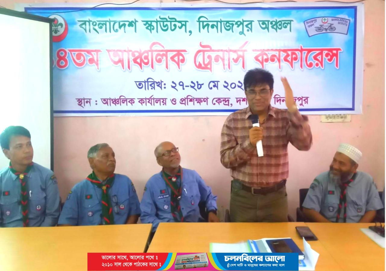 বাংলাদেশ স্কাউটস দিনাজপুর অঞ্চলের আয়োজনে আঞ্চলিক ট্রেনার্স কনফারেন্স ২৮ মে ২০২৩ শেষ হয়েছে। বিকেলে আঞ্চলিক স্কাউট প্রশিক্ষণ কেন্দ্র ও কার্যালয় দশমাইল, দিনাজপুরে অনুষ্ঠিত এ কনফারেন্সে সমাপণী অনুষ্ঠানে প্রধান অতিথি হিসেবে উপস্থিত ছিলেন দিনাজপুর শিক্ষা বোর্ডের চেয়ারম্যান ও আঞ্চলিক স্কাউটসের সভাপতি প্রফেসর মোঃ কামরুল ইসলাম। তিনি বলেন, “উন্নত ও স্মার্ট বাংলাদেশে বিনির্মানে প্রশিক্ষিত লিডারদের ভূমিকা গুরুত্বপূর্ণ”। তিনি স্কাউট ট্রেনারদের যুগের সাথে তাল মিলিয়ে তথ্য প্রযুক্তির জ্ঞান অর্জ ণ ও তা নিয়মিত অনুশীলনের মাধ্যমে আরও দক্ষ হবার পরামর্শ দেন। এসময় কনফারেন্স পরিচালক মুক্তা লাল রায় ঈশোর, আঞ্চলিক উপ পরিচালক মোঃ আব্দুর রশিদ, সাবেক আঞ্চলিক কমিশনার মোঃ আখতারুজ্জামন, আঞ্চলিক স্কাউটসের সহ সভাপতি মুহা. জালাল উদদীন বক্তব্য রাখেন। গত ২৭ মে শুরু হওয়া কনফারেন্সে ট্রেনারদের দক্ষতার সাথে প্রশিক্ষণ কোর্স বাস্তবায়নে কর্মকৌশল নির্ধারণ, আইসিটি বিষয়ক কোর্স আয়োজন, সঠিকভাবে কোর্স আয়োজন, যথাযথভাবে কোর্স প্রতিবেদন প্রেরণ, কোর্স পরবর্তি স্কাউট দল গঠন ইত্যাদি বিষয়ে আলোচনা হয়। কনফারেন্সে রংপুর বিভাগের আট জেলার ৫০ জন লিডার ট্রেনার ও সহকারী লিডার ট্রেনার অংশগ্রহণ করেন।