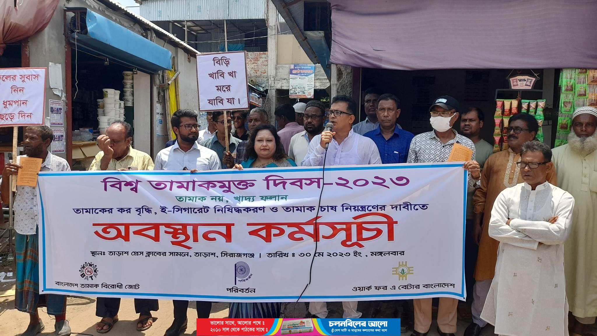 সিরাজগঞ্জের তাড়াশে বিশ্ব তামাকমুক্ত দিবস উপলক্ষে তামাকের কর বৃদ্ধি, ই-সিগারেট নিষিদ্ধকরণ ও তামাক চাষ নিয়ন্ত্রণের দাবিতে অবস্থান কর্মসূচি পালন করা হয়েছে। গতকাল মঙ্গলবার বেলা ১১ টার দিকে তাড়াশ প্রেসক্লাবের সামনে এ কর্মসূচি অনুষ্ঠিত হয়। তামাক মুক্ত দিবসের এবারের প্রতিপাদ্য বিষয় “ তামাক নয়, খাদ্য ফলান ”। ওয়ার্ক ফর এ বেটার বাংলাদেশ (ডবিøউবিবি) ট্রাস্টের সহযোগিতায় বেসরকারি উন্নয়ন সংস্থা পরিবর্তন তামাকের বিরুদ্ধে এ অবস্থান কর্মসূচির আয়োজন করে।