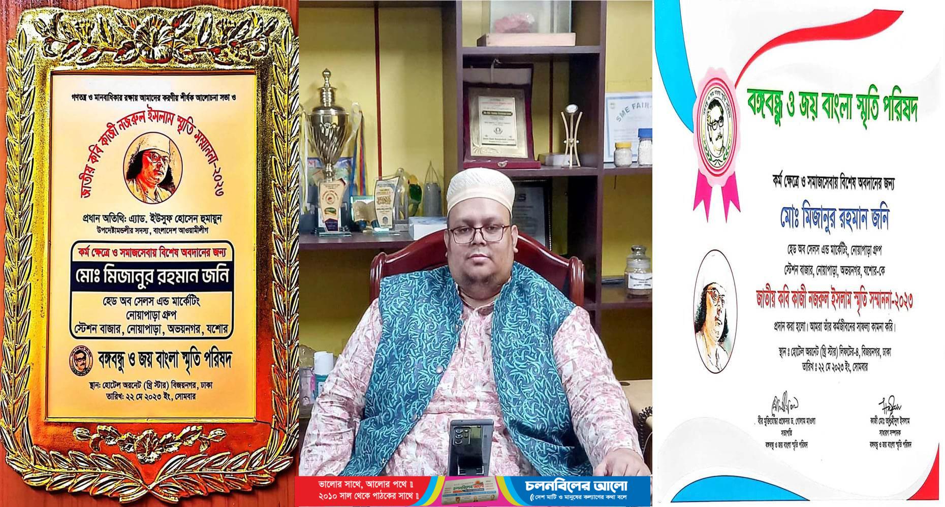 অভয়নগরের শিল্প-বানিজ্য ও বন্দর নগরী নওয়াপাড়ার স্টেশন বাজারে অবস্থিত নোয়াপাড়া গ্রুপের হেড অব সেলস এন্ড মার্কেটিং কর্মকর্তা মিজানুর রহমান জনিকে স্মারক সম্মাননা প্রদান করা হয়েছে। সোমবার সকালে হোটেল অরনেট বিজয়নগর ঢাকায় কর্মক্ষেত্রে ও সমাজসেবায় বিশেষ অবদান রাখায় ‘বঙ্গবন্ধু ও জয়বাংলা স্মৃতি পরিষদের’ পক্ষ থেকে জাতীয় কবি কাজী নজরুল ইসলাম স্মৃতি সম্মাননা ২০২৩ প্রদান করা হয়। বঙ্গবন্ধু ও জয়বাংলা স্মৃতি পরিষদের সভাপতি বীর মুক্তিযোদ্ধা প্রফেসর ড. গোলাম মাওলা ও সাধারণ সম্পাদক কাজী তাওহীদুল ইসলামের স্বাক্ষরিত একটি সনদ ও স্মারক সম্মাননা প্রদান করা হয়েছে।গণতন্ত্র ও মানবাধিকার রক্ষায় আমাদের করণীয় শীর্ষক আলোচনা সভা ও জাতীয় কবি কাজী নজরুল ইসলাম স্মৃতি সন্মাননা অনুষ্টানে প্রধান অতিথি ছিলেন, বাংলাদেশ আওয়ামী লীগের উপদেষ্ঠা মন্ডলীর সদস্য এ্যাড. ইউসুফ হোসেন হুমায়ুন।বঙ্গবন্ধু ও জয়বাংলা স্মৃতি পরিষদের নেতৃবৃন্দ জানান, নোয়াপাড়া গ্রুপের হেড অব সেলস এন্ড মার্কেটিং কর্মকর্তা মিজারুর রহমান জনিকে জাতীয় কবি কাজী নজরুল ইসলাম স্মৃতি সম্মাননা প্রদান করা হয়েছে। আমরা তার ও তাহার প্রতিষ্ঠানের সর্বাঙ্গীন কল্যাণ ও সমৃদ্ধি কামনা করছি। আপনার এ মহতী কর্মকান্ডে দেশ ও জাতির অগ্রগতি ও সমৃদ্ধির পথ উন্মোচনে বিশেষ ভ‚মিকা রাখবে। মিজানুর রহমান জনি বঙ্গবন্ধু ও জয়বাংলা স্মৃতি পরিষদের সকল কর্মকর্তাগনকে আন্তরিক অভিনন্দন জানিয়েছেন।