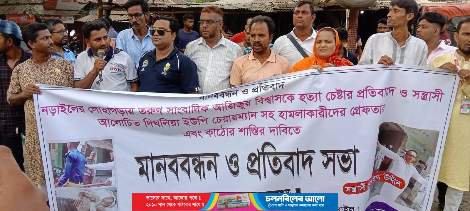 দৈনিক আই বার্তা পত্রিকার বিশেষ প্রতিনিধি ও দৈনিক প্রবাহ পত্রিকার সাংবাদিক আজিজুর বিশ্বাসকে হকিষ্টিক দিয়ে পিটিয়ে হত্যা চেষ্টার প্রতিবাদে ও সন্ত্রাসী, উপজেলার আলোচিত দিঘলিয়া ইউপি চেয়ারম্যান সৈয়দ বোরহান উদ্দিনসহ হামলাকারীদের গ্রেপ্তার কঠোর শাস্তির দাবি জানানো হয়।