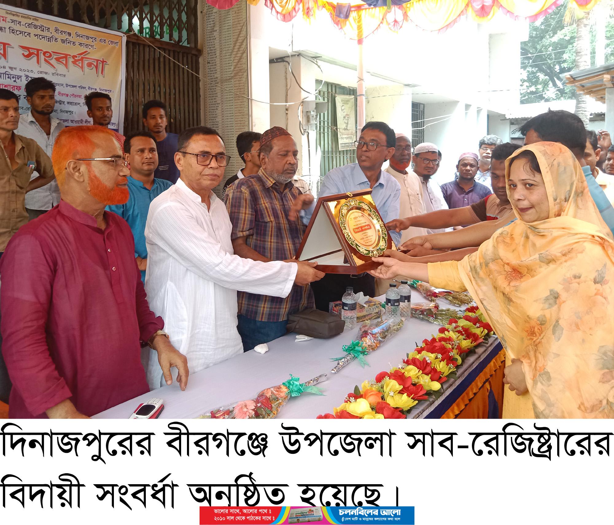 দিনাজপুরের বীরগঞ্জ উপজেলা সাব-রেজিষ্ট্রার মোঃ জহুরুল ইসলামের প্রদোন্নতি জনিত বিদায়ী সংবর্ধনা অনুষ্ঠিত হয়েছে। উপজেলা সাব-রেজিষ্ট্রার অফিস কর্মচারী, দলিল লেখক সমিতি, স্ট্যাম্প ভেন্ডার ও নকল নবিশবৃন্দদের আয়োজনে রবিবার (৪ জুন-২০২৩) দুপুরে অফিস প্রাঙ্গণে উক্ত বিদায়ী সংবর্ধনা অনুষ্ঠিত হয়।