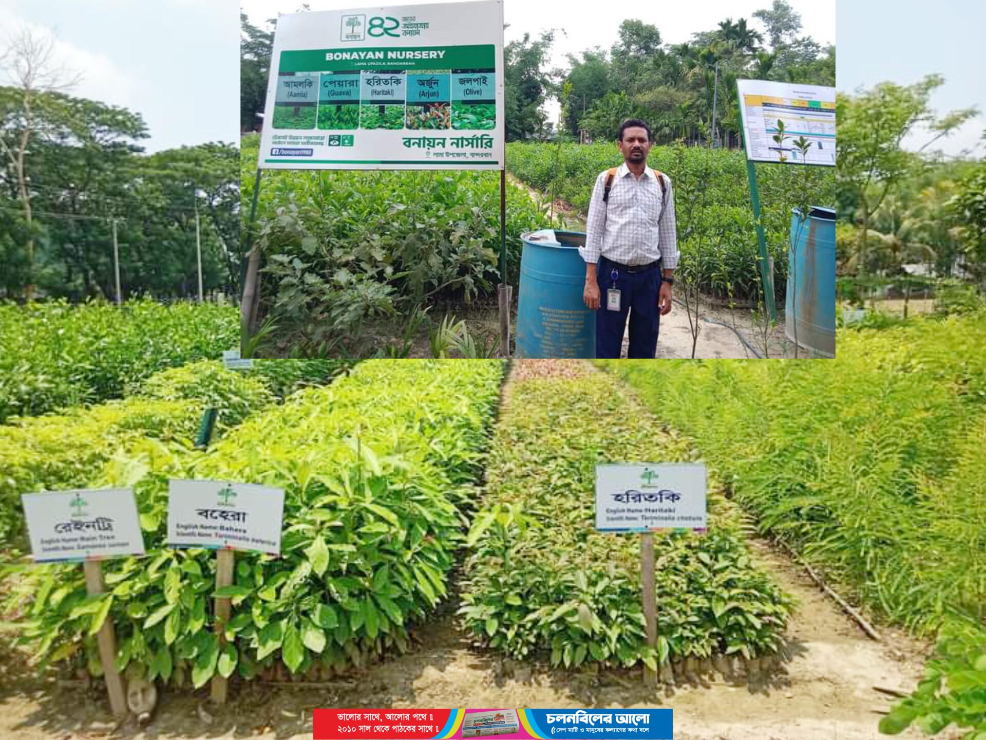 লামা পৌর এলাকার হরিণঝিরি ব্যবসায়ি ও বনায়ন নার্সারি উদ্যোক্তা মোঃ নুরুজ্জামান “বনায়ন নার্সারি” নামে সরেজমিনে দেখা যায়, লামা পৌর এলাকার দক্ষিণ দিকে (৯নং ওয়ার্ড) হরিণঝিরি ও শীলেরতোয়া মার্মা পাড়ার মেইন রোড়ের পাশে শ্রমিক জাহেদুল ইসলাম ও দেখাশুনা তদারকির দায়িত্ব থাকা হাসিনা বেগম নার্সারীতে দেখা যায়। (৪ ও ৫ জুন) সেখানে তারা চারা গাছের পরিচর্যাসহ পানি দিচ্ছে। প্রায় এক একর জায়গা বিভিন্ন জাতের বনজ,ফলজ ও ঔষধি গাছের পসরা বা সমাহার। এটি সে ২০০১ সালে ছোট পরিসরে শুরু করে এখন বড় আকারে পরিণত হয়েছে। এতে কিছু মানুষের কর্মসংস্থানও হয়েছে। নিজের নার্সারী ব্যবসার লাভের পাশাপাশি এলাকায় সবুজ বনায়নে ভূমিকা রাখছে। এটি অনেক বৈচিত্র্যময় সুন্দর ও সুস্থ ও স্বস্তির নির্মল অক্সিজেন উপভোগ্য।