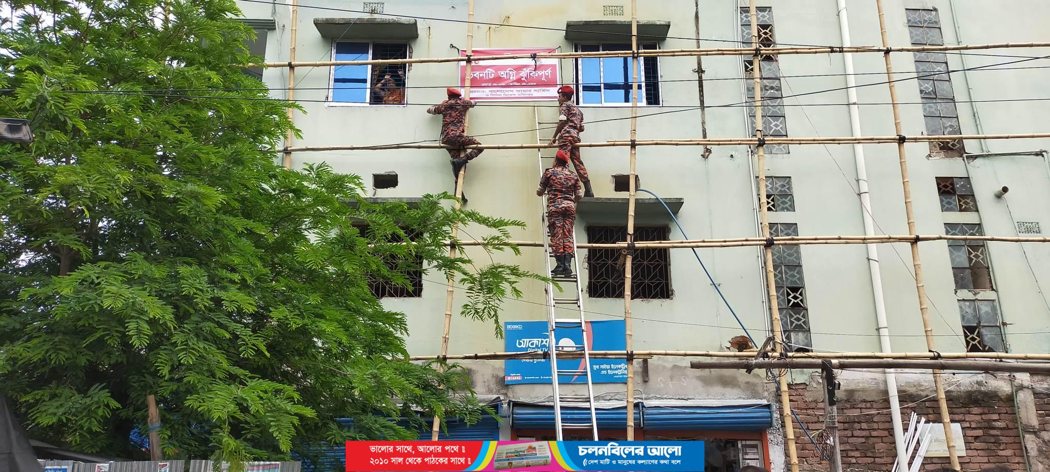 সোমবার সকালে ফায়ার সার্ভিস কতৃপক্ষ অগ্নি ঝুঁকিপূর্ণ ঘোষণা সম্বলিত দুটি ব্যানার ঝুলিয়ে দিয়েছেন ভবনের দু’পাশে।