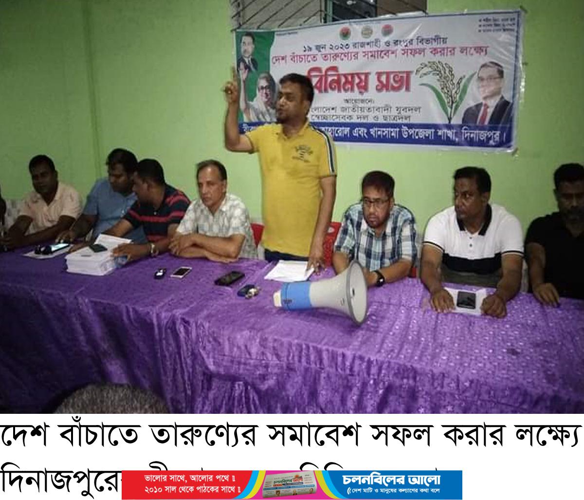 বর্তমান সরকারের বিরুদ্ধে চলমান আন্দোলনকে বেগবান করতে আগামী ১৯জুন রাজশাহী ও রংপুর বিভাগীয় দেশ বাঁচাতে তারুণ্যের সমাবেশ সমাবেশ সফল করার লক্ষ্যে দিনাজপুরের বীরগঞ্জে যুবদল, স্বেচ্ছাসেবক দল ও ছাত্রদলের মত বিনিময় সভা অনুষ্ঠিত। সভায় জেলার বীরগঞ্জ, কাহারোল ও খানসামা এই তিন উপজেলার বিএনপি এবং সহযোগী সংগঠনের কয়েক শাতধিক নেতৃবৃন্দ উপস্থিত ছিলেন।