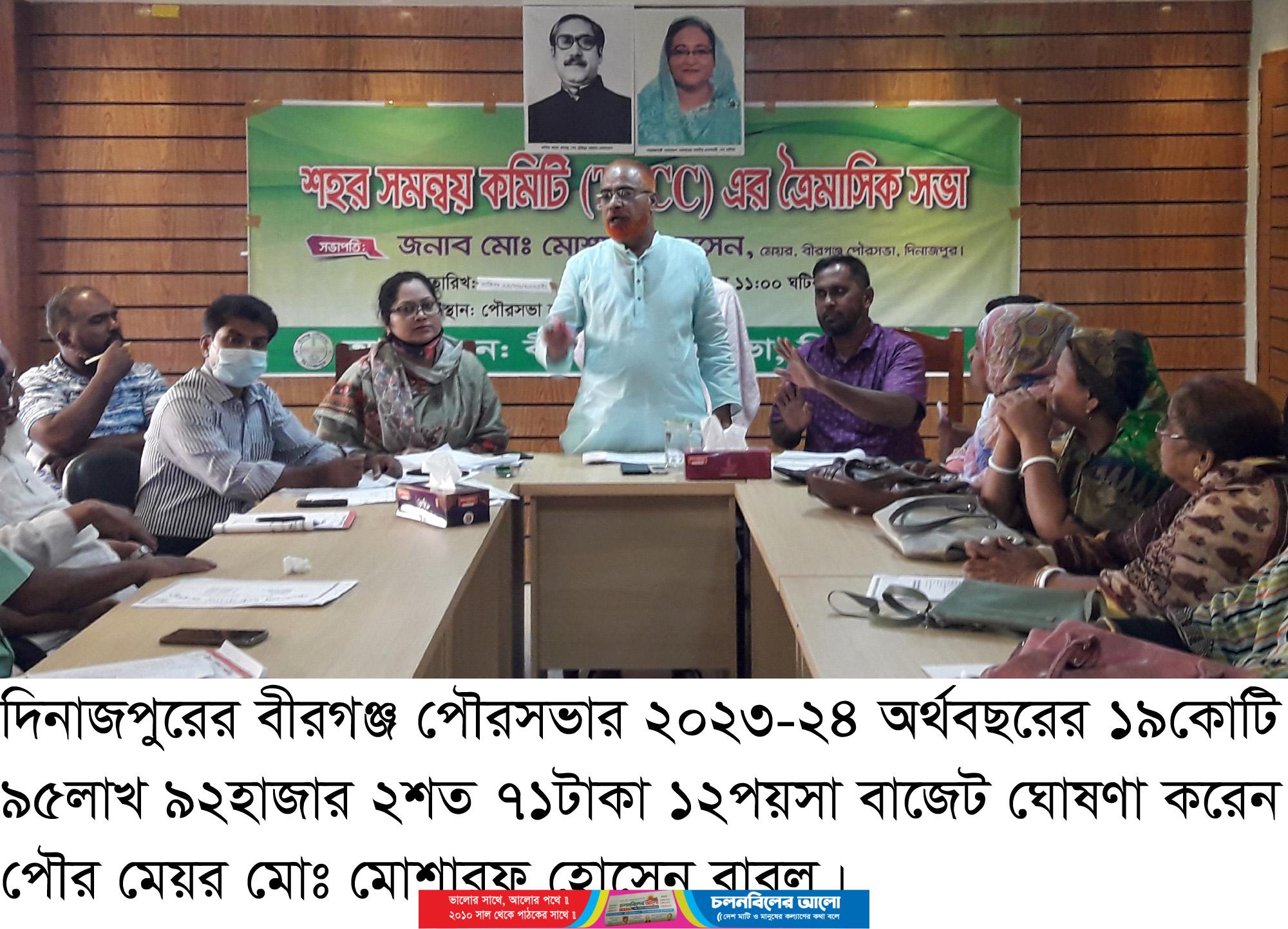 দিনাজপুরের বীরগঞ্জ পৌরসভার ২০২৩-২৪ অর্থবছরের ১৯কোটি ৯৫লাখ ৯২হাজার ২শত ৭১টাকা ১২পয়সা বাজেট ঘোষণা করা হয়েছে। বৃহস্পতিবার সকাল ১১টায় বীরগঞ্জ পৌরসভা হল রুমে প্রস্তাবিত বাজেট ঘোষনা করেন মেয়র মোঃ মোশারফ হোসেন বাবুল।