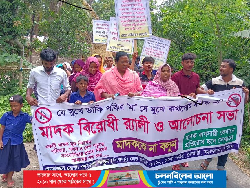নাটোরের বড়াইগ্রামে “যে মুখে মা ডাকি সেই মুখে মাদক নয়” প্রতিবাদ্যকে সামনে রেখে মাদক বিরোধী র্যালি ও আলোচনা সভা অনুষ্ঠিত হয়েছে। সোমবার দুপুরে জেলা পর্যায়ে শ্রেষ্ঠ জয়ীতা নারী ও বিনামুল্যে এ্যাম্বুল্যান্স সেবাদানকারী স্কুল শিক্ষিকা শেফালী খাতুন এই কর্মসূচীর আয়োজন করে। উপজেলার দোগাছী গ্রামের একটি কিন্ডার গার্টেন থেকে দেশের বিভিন্ন বিশ্ববিদ্যালয় পড়ুয়া শিক্ষার্থী, এলাকাবাসী ও স্থানীয় শিক্ষার্থীদের সমন্বয়ে র্যালিটি মেরীগাছা বাজার প্রদর্শন করে শেষ হয়।