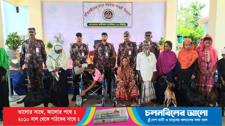 পার্বত্য বান্দরবানের আলীকদম উপজেলার দুর্গম এলাকায় বর্ডার গার্ড বাংলাদেশ আলীকদম ব্যাটালিয়ন (৫৭ বিজিবি) কর্তৃক স্থানীয় অসহায় ও দুস্থ পরিবারের মাঝে ছাগল ও নগদ অর্থ এবং প্রতিবন্ধীদের মাঝে হুইল চেয়ার বিতরণ কার্যক্রম অনুষ্ঠিত হয়েছে। মঙ্গলবার (৪ জুলাই) সকাল ১১ টায় বর্ডার গার্ড বাংলাদেশ আলীকদম ব্যাটালিয়ন (৫৭ বিজিবি) এর সার্বিক তত্ত্বাবধানে উপজেলা সদর এলাকার স্থানীয় অসহায় ও দুস্থ পরিবারকে স্বাবলম্বী করে গড়ে তোলার লক্ষ্যে ১৩টি পরিবারকে ১৩টি ছাগল, ১৪ টি পরিবারকে ৮৫ হাজার টাকা এবং ২ জন প্রতিবন্ধী ব্যক্তিকে ২টি হুইল চেয়ারসহ সর্বমোট ২৯ টি পরিবারকে বিশেষ মানবিক সহায়তা সামগ্রী বিতরণ করা হয়।