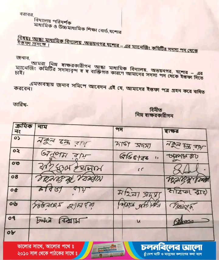 অভয়নগরে বিদ্যালয়ের সভাপতির উপর ক্ষুব্ধ হয়ে ম্যানেজিং কমিটির ৭ সদস্যের পদত্যাগ