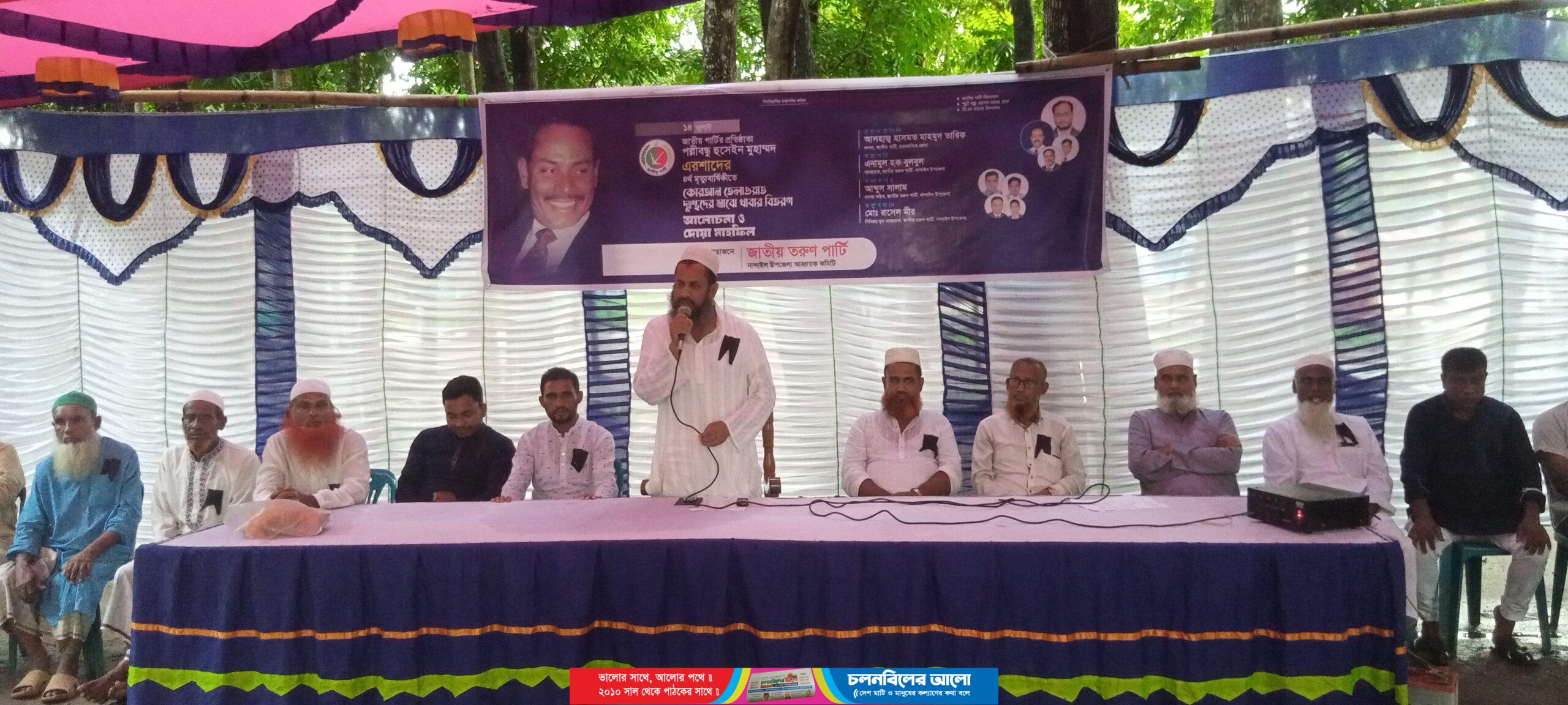 ময়মনসিংহে জাতীয় তরুন পার্টি নান্দাইল উপজেলা শাখার উদ্যোগে শুক্রবার বিকাল ৫ ঘটিকায় উপজেলা পরিষদের পিছনে বাগান বাড়ির সামনে জাতীয় পার্টির সাবেক চেয়ারম্যান ও রাষ্ট্রপতি পল্লীবন্দু হুসেইন মুহম্মদ এরশাদের ৪র্থ মৃত্যু বার্ষিকী উপলক্ষে আলোচনা সভা ও দোয়া মাহফিল অনুষ্ঠিত হয়। জাতীয় তরুন পার্টি নান্দাইল উপজেলা শাখার সভাপতি মোঃ এমদাদুল হক বুলবুলের সভাপতিত্বে, জাতীয় তরুন পার্টির সাধারণ সম্পাদক মোঃ আব্দুল সালামের সঞ্চালনায়, প্রধান অতিথি হিসেবে বক্তব্য রাখেন ময়মনসিংহ জেলা জাতীয় পার্টির অন্যতম সদস্য, আগামী দ্বাদশ জাতীয় সংসদ নির্বাচনে ময়মনসিংহ -৯ নান্দাইল আসনে জাতীয় পার্টির মনোনয়ন প্রত্যাশী আলহাজ্ব হাসমত মাহমুদ (তারিক ভূঁইয়া)। তিনি বলেন হুসেইন মুহম্মদ এরশাদ রাষ্ট্র র্ধম ইসলাম ও পবিত্র শুক্রবার কে সাপ্তাহিক ছুটির দিন ঘোষণা করেন, তার অবদান এদেশের জনগণ কখনোই ভুলতে পারবে না। আমরা তার বিদ্রোহী আত্মার মাগফিরাত কামনা করছি। এছাড়া আরো বক্তব্য রাখেন আজহারুল ইসলাম রতন, রবিকুল ইসলাম, আবদুস সাত্তার, আবুল কালাম, আবুল হাসিম ভূঁইয়া মিলন,রফিক উদ্দিন ভুঁইয়া,রাসেল মীর। উপস্থিত ছিলেন জাতীয় পার্টি,উলামা পার্টি, জাতীয় যুব সংহতি,শ্রমিক পার্টি ও তরুণ পাটির সহ বিভিন্ন অংগ সংগঠনের নেতৃবৃন্দ উপস্থিত ছিলেন। উল্লেখ্য দুপুর ১১ঘটিকায় আলহাজ্ব হাসমত মাহমুদ তারিক ভূঁইয়ার ব্যক্তিগত কার্যালয়ে পবিত্র কোরআন খতম ও দোয়া মাহফিল, এবং গরীব,মিসকিন ও মাদ্রাসার ছাত্রদের মাঝে খাবার বিতরণ করেন ।