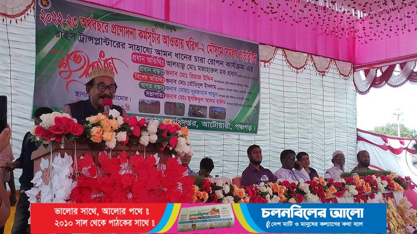পঞ্চগড়ের আটোয়ারী উপজেলা কৃষি সম্প্রসারণ অধিদপ্তরের বাস্তবায়নে ২০২২- ২৩ অর্থবছরে প্রনোদনা কর্মসুচির আওতায় খরিপ-২ মৌসুমে সমলয় চাষাবাদে রাইস ট্রান্সপ্লান্টারের সাহায্যে আমন ধানের চারা রোপন কার্যক্রম শুভ উদ্বোধন করা হয়েছে। মঙ্গলবার ( ১৮ জুলাই) দুপুরে উপজেলার ধামোর ইউনিয়নের যুগিকাটা এলাকায় ৫০ একর জমিতে সমলয় চাষাবাদে রাইস ট্রান্সপ্লান্টারের সাহায্যে আমন ধানের চারা রোপন কার্যক্রম শুভ উদ্বোধন করেন অনুষ্ঠানের প্রধান অতিথি পঞ্চগড়-১ আসনের সংসদ সদস্য আলহাজ¦ মোঃ মজাহারুল হক প্রধান। উদ্বোধন অনুষ্ঠানে আলোচনা সভায় সভাপতিত্ব করেন উপজেলা নির্বাহী অফিসার মোঃ মুসফিকুল আলম হালিম। আলোচনার শুরুতে উপজেলা কৃষি অফিসার মোছাঃ নুরজাহান খাতুন স্বাগত বক্তব্যে বলেন, কৃষকের উন্নয়নের জন্য সরকার কৃষি প্রনোদনা সহায়তার আওতায় কৃষি যন্ত্র বিতরণ, সুলভ মূল্যে কৃষি উপকরণ প্রদান সহ নানাবিধ সুবিধা প্রদান করে যাচ্ছেন। ট্রান্সপ্লান্টারের মাধ্যমে এক বিঘা জমি চারা রোপন করতে সময় লাগে এক ঘন্টা এবং খরচ হয় মাত্র ৫০০/-টাকা। যেখানে শ্রমিক দিয়ে রোপন করলে খরচ হয় ২০০০/- থেকে ২৫০০/- টাকা। তাই ট্রান্সপ্লান্টারে রোপন করলে শ্রম, সময় ও অর্থ কম লাগে বা সাশ্রয় হয়। প্রধান অতিথির বক্তব্যে আলহাজ¦ মজাহারুল হক প্রধান এমপি বলেন, বর্তমান কৃষক বান্ধব সরকার কৃষকদের কৃষি খাতে ব্যাপক ভুর্তুকি দিচ্ছেন। কৃষি যন্ত্রপাতিতে ভুর্তুকি, বীজ, সার সহ বিভিন্ন ক্ষেত্রে ভুর্তুকি দিয়ে আসছেন। ধান সহ বিভিন্ন ফসল উৎপাদন বৃদ্ধি করার লক্ষ্যে সমলয় ভিত্তিতে চাষাবাদের কার্যক্রম গ্রহণ করেছেন। মানুষ বাড়লেও বাড়ছে না জমি, তাই স্বল্প জমিতে অধিক ফসল উৎপাদন করে নিরাপদ ও পুষ্টি খাদ্য চাহিদা পুরণ করতে হবে। তিনি আরও বলেন, রাইস ট্রান্সপ্লান্টারের মাধ্যমে এক সাথে প্রদর্শনী ব্লকের কৃষকদের যেমন সময় সাশ্রয় হবে অন্যদিকে কৃষকের উৎপাদন খরচও কম হবে এবং কৃষকেরা লাভবান হবেন। তাছাড়া বর্তমান সরকারের সময়োচিত পদক্ষেপের জন্য কৃষকগণ চাষাবাদে অনুপ্রানিত হচ্ছে বলে তিনি অভিমত ব্যাক্ত করেন। অনুষ্ঠানে প্রধান বক্তা হিসেবে বক্তব্য রাখেন, জেলা কৃষি সম্প্রসারণ অধিদপ্তরের উপ-পরিচালক মোঃ রিয়াজ উদ্দীন। আরো বক্তব্য রাখেন,অতিরিক্ত উপ-পরিচালক মোঃ শাহ্ আলম, মহিলা ভাইস চেয়ারম্যান রেনু একরাম, উপজেলা আওয়ামী লীগের সাধারণ সম্পাদক এমদাদুল হক, সাবেক উপজেলা মুক্তিযোদ্ধা কমান্ডার নজরুল ইসলাম, ধামোর ইউপি চেয়ারম্যান আবু তাহের দুলাল, কৃষকের পক্ষ থেকে ওই এলাকার আদর্শ কৃষক আব্দুস সালাম প্রমুখ। অনুষ্ঠানে অন্যান্যদের মধ্যে উপস্থিত ছিলেন কৃষি বিভাগের উপ-সহকারী কৃষি কর্মকর্তগণ, প্রায় শতাধীক কৃষক-কৃষাণী সহ জেলা ও উপজেলা পর্য