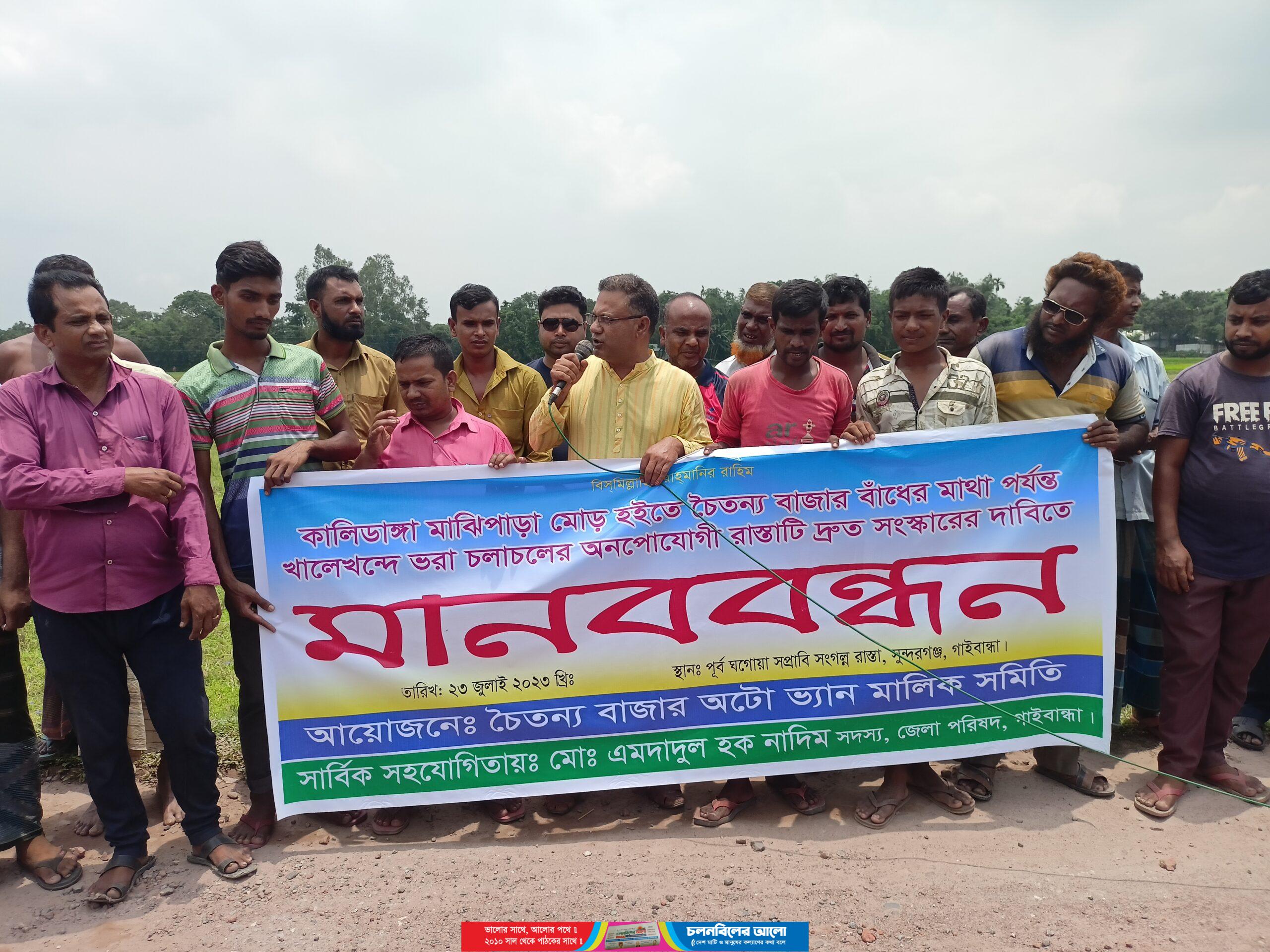 গাইবান্ধার সুন্দরগঞ্জে বছর দেড়েক ধরে রাস্তা সম্প্রসারণ ও সংস্কারের কাজ বন্ধ থাকায় প্রতিনিয়ত নানান দুর্ঘটনাসহ চরম ভোগন্তির শিকার হচ্ছেন মানুষ। ভ্যানে সন্তান প্রসবও করেছিলেন এক প্রসূতি মা। রাস্তাটির দ্রুত সম্প্রসারণ ও সংস্কারের জন্য বাধ্য হয়ে মানবন্ধন করেছেন এলাকাবাসি।
