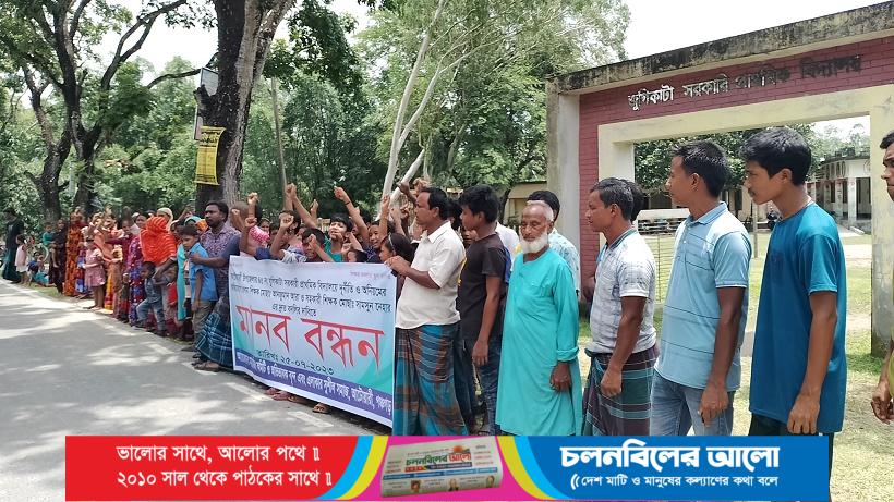 পঞ্চগড়ের আটোয়ারী উপজেলার জুগিকাটা সরকারি প্রাথমিক বিদ্যালয়ের প্রধান শিক্ষক ও সহকারী শিক্ষকের বদলীর দাবীতে মানববন্ধন করেছে বিদ্যালয়টির পরিচালনা কমিটির সদস্য, শিক্ষার্থী, অভিভাবক সদস্যরা সহ স্থানীয় সুশীল সমাজ। মঙ্গলবার (২৫ জুলাই) দুপুরে উপজেলার ধামোর ইউনিয়নের জুগিকাটা সরকারি প্রাথমিক বিদ্যালয়ের প্রধান ফটকের সামনে পঞ্চগড় – আটোয়ারী সড়কের পাশে দাড়িয়ে ঘন্টাব্যাপি এই মানববন্ধন কর্মসুচি পালিত হয়। এসময় বক্তব্য রাখেন, জুগিকাটা সরকারি প্রাথমিক বিদ্যালয়ের সভাপতি অনিল চন্দ্র পাল, অভিভাবক মহেন্দ্র বর্মন, হৈমন্তি রাণী, মলীন রায় , পারভীন আকতার প্রমুখ। মানববন্ধনে বক্তারা বলেন, জুগিকাটা সরকারি প্রাথমিক বিদ্যালয়ের প্রধান শিক্ষক আঞ্জুমান আরা দীর্ঘদিন ধরে এই বিদ্যালয়ে আছেন। তিনি নিজের খেয়াল খুশিমত বিদ্যালয় পরিচালনা করেন। বিদ্যালয়ের শিক্ষকেরা শ্রেণিকক্ষে সময় না দিয়ে বিদ্যালয়ের একটি কক্ষে রাখা বিছানায় ঘুমিয়ে পড়েন। সেই সাথে এনিয়ে কোন কথা বলা হলে অভিভাবকদের সঙ্গেও দুর্ব্যবহার করেন তারা। এক সময় শিশুদের পদচারণায় মুখর থাকা বিদ্যালয়টি এখন শিক্ষার্থী সংকটে। কাগজ কলমে শতাধীক শিক্ষার্থী থাকলেও প্রতিদিন ২০ জনও উপস্থিত থাকে না। বক্তারা আরো বলেন, প্রধান শিক্ষক আঞ্জুমান আরা ও সহকারী শিক্ষক শামসুন নেহার বিদ্যালয়ে নানা অনিয়ম করে আসছেন। তাই তাদের দু’জনকে বিদ্যালয় থেকে বদলী না করা হলে শিক্ষার্থীদের বিদ্যালয়ে পাঠানো হবে না বলে হুঁশিয়ারী দেন অভিভাবকরা। পরে বিকেলে উপজেলা নির্বাহী অফিসার বরাবরে প্রধান শিক্ষক আঞ্জুমান আরা’র বিরুদ্ধে দুর্নীতি ও অনিয়মের গণঅভিযোগ পত্র দাখিল করেছেন বলে জানিয়েছেন ওই বিদ্যালয়ের সভাপতি অনিল চন্দ্র পাল।