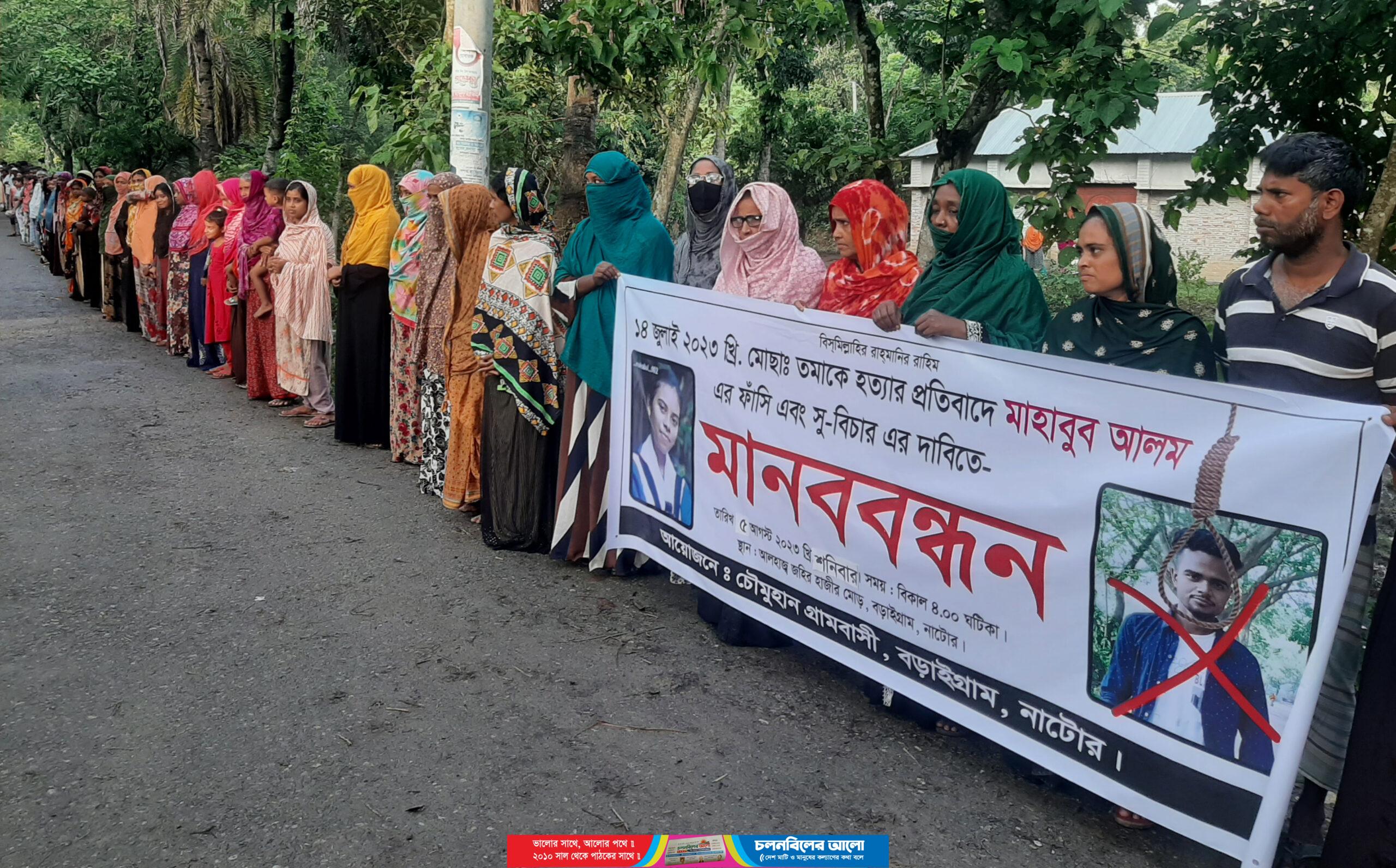 নাটোরের বড়াইগ্রামে তমা খাতুনের (১৭) হত্যার বিচারের দাবিতে মানববন্ধন করেছেন এলাকাবাসী ও পরিবারের সদস্যরা। শনিবার সকাল সাড়ে ১০টা থেকে তমার নিজ গ্রাম চৌমুহনে ঘণ্টাব্যাপী মানববন্ধন অনুষ্ঠিত হয়। মানববন্ধনে নিহত তমার বাবা তাইদুল ইসলাম, মা গোলাপী বেগমসহ স্বজন ও এলাকাবাসী বক্তব্য দেন।