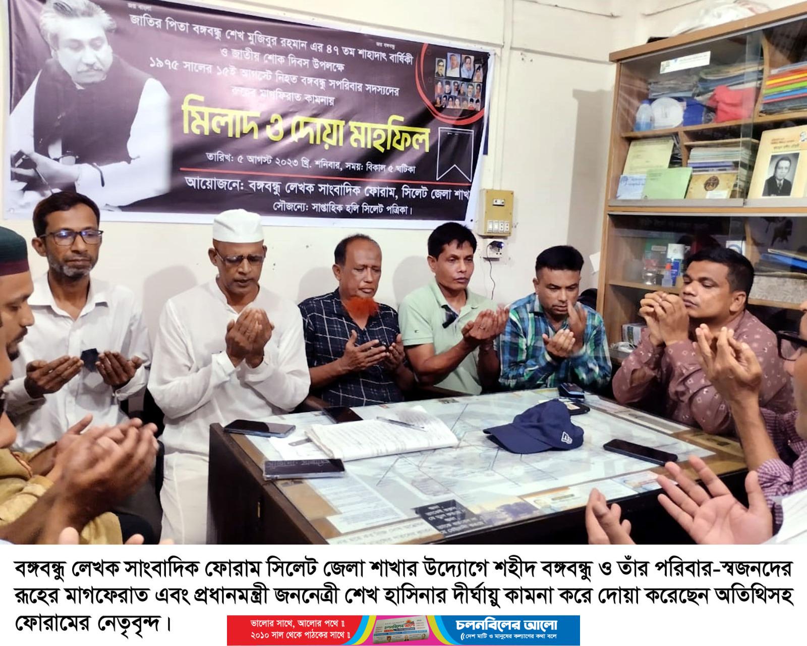 হাজার বছরের শ্রেষ্ট বাঙ্গালী জাতির জনক বঙ্গবন্ধু শেখ মুজিবুর রহমান এর ৪৭তম শাহাদত বার্ষিকী, জাতীয় শোক দিবস ও শহীদ শেখ কামাল এর ৭৪তম জন্ম বার্ষিকী উপলক্ষে বঙ্গবন্ধু লেখক সাংবাদিক ফোরাম সিলেট জেলা শাখার উদ্যোগে এক আলোচনা সভা ও দোয়া মাহফিল শনিবার (৫ আগস্ট ২৩) বিকালে নগরীর পুরান লেনস্থ ৫৩নং সমবায় ভবনের অস্থায়ী কার্যালয়ে অনুষ্ঠিত হয়।