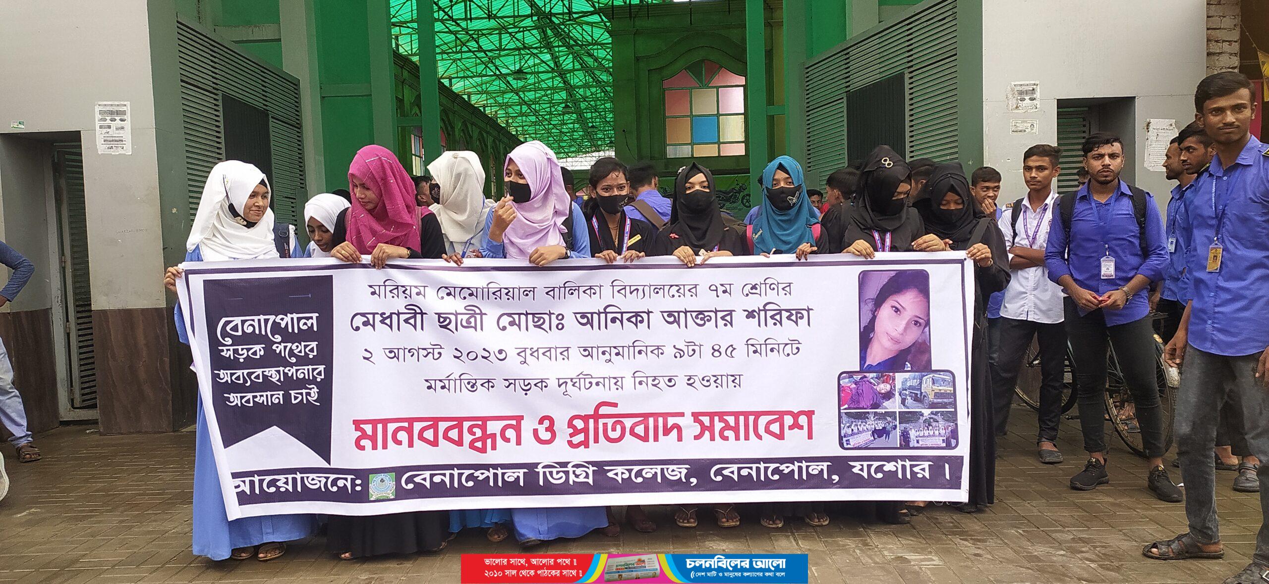 ‘নিরাপদ সড়ক চাই-মায়ের কোল শূণ্য হওয়ার বিচার চাই-বেনাপোলে সড়ক পথের অব্যবস্থাপনার অবসান চাই’-এই প্লাকার্ড বহন করে ট্রাক চাপায় ৭ম শ্রেণীর মেধাবী স্কুল ছাত্রী আনিকা আক্তার শরিফা নিহতের প্রতিবাদে বেনাপোল মরিয়ম মেমোরিয়াল বালিকা বিদ্যালয়ের ও বেনাপোল ডিগ্রী কলেজের শত শত শিক্ষার্থীরা মানববন্ধন ও প্রতিবাদ সমাবেশ করেছেন বেনাপোল-কলকাতা প্রধান সড়কে।