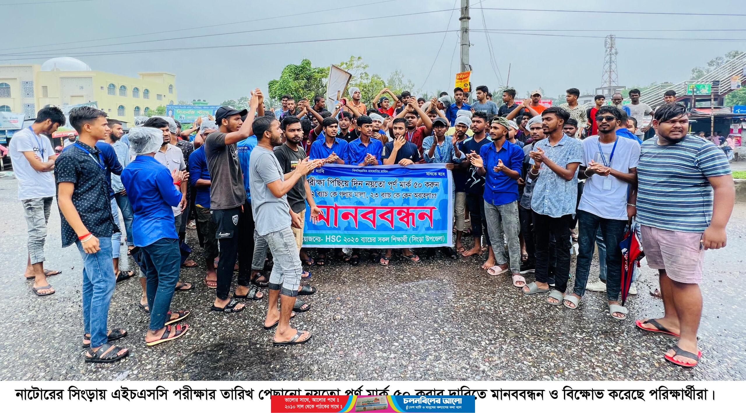 ‘২২ ব্যাচকে গলায় মালা, ২৩ ব্যাচকে কেন অবহেলা’ প্রতিপাদ্য নিয়ে এইচএসসি পরীক্ষার তারিখ পেছানো ও পূর্ণ মার্ক ৫০ করার দাবিতে মানববন্ধন ও বিক্ষোভ মিছিল করেছে নাটোরের সিংড়া উপজেলার পরিক্ষার্থীরা।