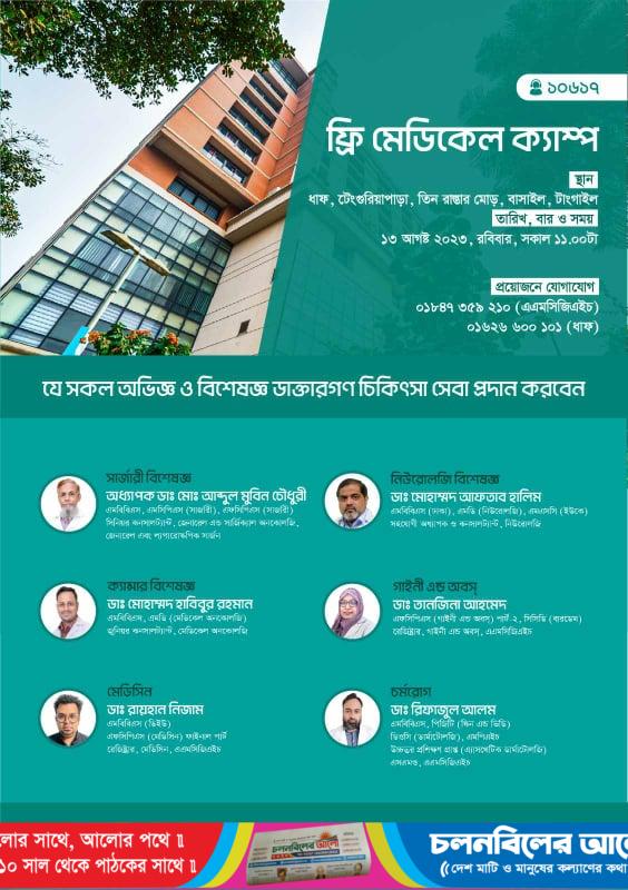 ডায়াবেটিস এন্ড হাইপারটেনশন এ্যাওয়ারনেস ফাউন্ডেশন ধাফ (DHAF) এর আয়োজনে ফ্রি_মেডিকেল_ক্যাম্প অনুষ্ঠিত হবে। ফ্রি মেডিকেল ক্যাম্পে ঢাকা আহ্ছানিয়া মিশন ক্যান্সার এন্ড জেনারেল হাসপাতাল হতে আগত মেডিকেল ক্যাম্পে সার্জারী, নিউরোলজি, ক্যান্সার,গাইনী, মেডিসিন, চর্মরোগ বিশেষজ্ঞ ডাক্তারগণ ফ্রি চিকিৎসা প্রদান করবেন ৷