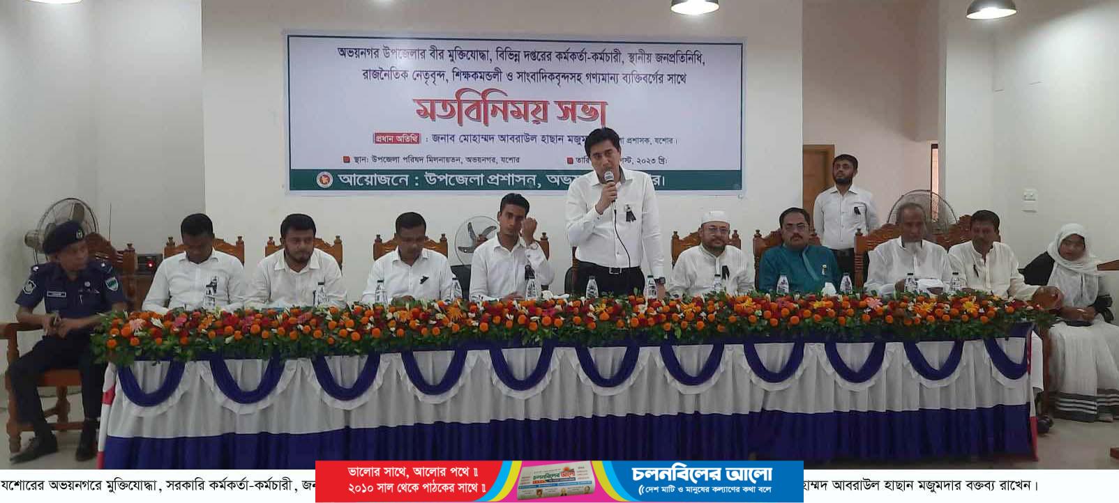 যশোরের অভয়নগরে মুক্তিযোদ্ধা, বিভিন্ন দপ্তরের কর্মকর্তা-কর্মচারী, স্থানীয় জনপ্রতিনিধি, রাজনৈতিক নেতৃবৃন্দ, শিক্ষকমন্ডলী, সাংবাদিকবৃন্দসহ গণ্যমান্য ব্যক্তিবর্গের সঙ্গে মতবিনিময় সভা অনুষ্ঠিত হয়েছে। উপজেলা প্রশাসনের আয়োজনে গতকাল বুধবার দুপুরে উপজেলা পরিষদ মিলনায়তনে এ মতবিনিময় সভা অনুষ্ঠিত হয়।