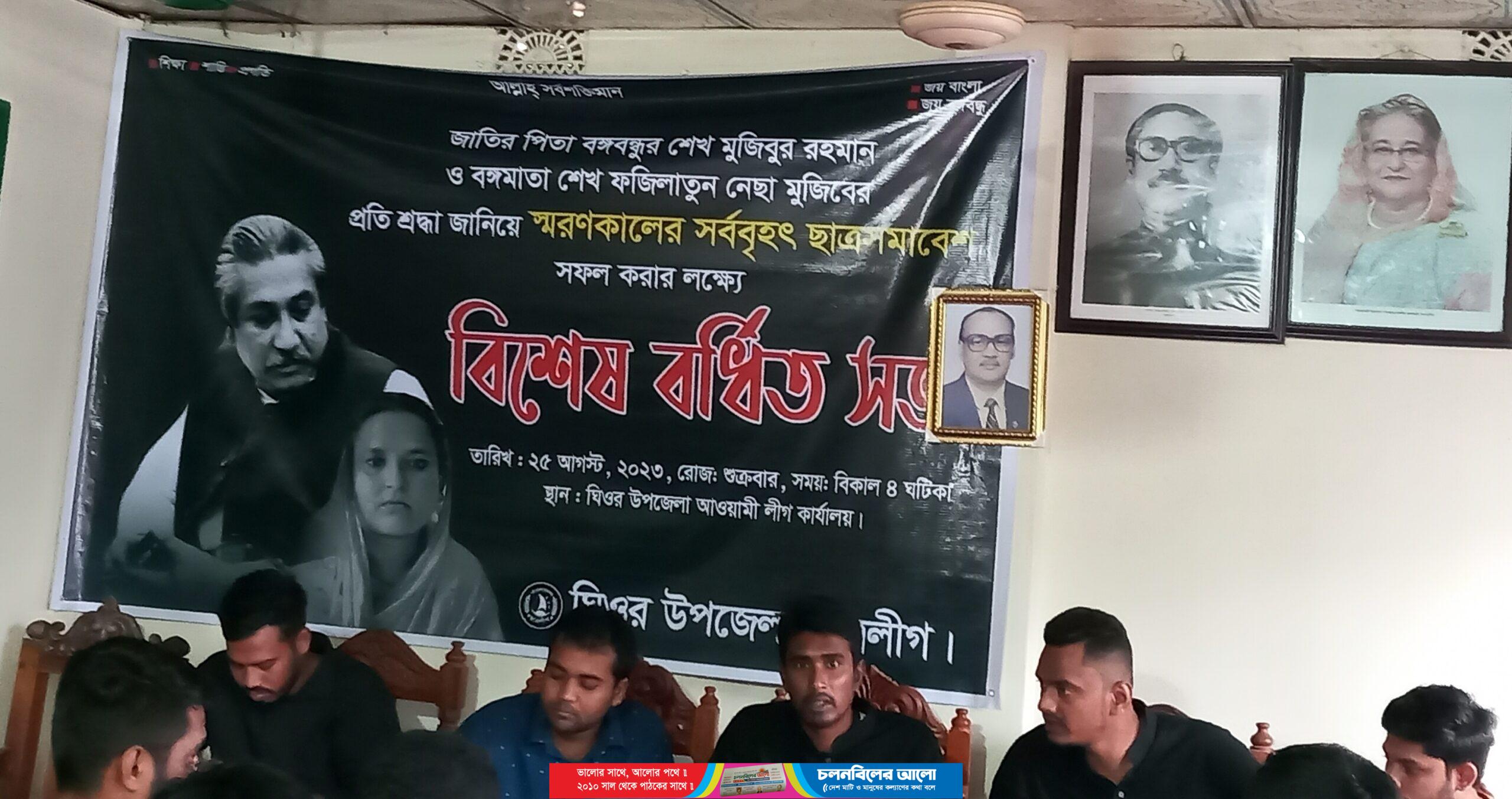 আগামী ১ সেপ্টেম্বর শুক্রবার জাতির পিতা বঙ্গবন্ধু শেখ মুজিবুর রহমান ও বঙ্গ মাতা শেখ ফজিলাতুন্নেছা মুজিবের প্রতি শ্রদ্ধা জানিয়ে বাংলাদেশ ছাত্রলীগ আয়োজিত স্বরণ কালের সর্ববৃহৎ ছাত্র সমাবেশ কে সফল করতে, মানিকগঞ্জ জেলা ছাত্রলীগের দিকনির্দেশনা অনুযায়ী বিশেষ বর্ধিত সভা করেছে ঘিওর উপজেলা ছাত্রলীগ। শুক্রবার বিকেল ৪ টার সময় উপজেলা আওয়ামী লীগ পার্টি অফিসে এই বিশেষ বর্ধিত সভার আয়োজন করা হয়। এসময় উপস্থিত থাকা বিভিন্ন ইউনিয়ন ও ওয়ার্ড শাখা ছাত্রলীগের নেতা কর্মীদের উদ্দেশ্যে বিভিন্ন দিকনির্দেশনা দিয়ে বক্তব্য রাখেন, উপজেলা ছাত্রলীগের আহ্বায়ক – মেহেদী হাসান রনি, যুগ্ম আহ্বায়ক শুভ আহমেদ টোকন,সদস্য আজিজুর রহমান। এসময় উপজেলা ছাত্রলীগসহ বিভিন্ন ইউনিয়ন ও ওয়ার্ড শাখা ছাত্রলীগের নেতা কর্মীরা উপস্থিত ছিলেন।