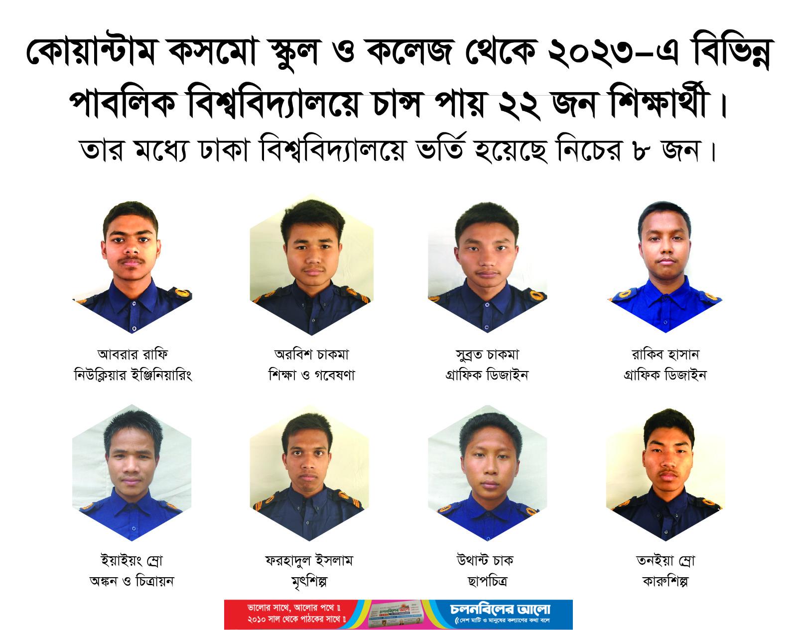 ঢাকা বিশ্ববিদ্যালয়ে নিউক্লিয়ার ইঞ্জিনিয়ারিং বিভাগে চান্স পাওয়া আবরার রাফির ছোট থেকে ইঞ্জিনিয়ারিং পড়ার খুব ইচ্ছে ছিল। সে বলে, এই সুস্পষ্ট মনছবি আমি দেখেছি আমার স্কুলে থাকা অবস্থায়। তাই আত্মবিশ্বাস নিয়ে পরিশ্রম করে গেছি। একই বিশ্ববিদ্যালয়ে শিক্ষা ও গবেষণা বিভাগে মেধাতালিকায় ভর্তি হয় অরবিশ চাকমা। সে বলে, আমি আগে থেকেই লক্ষ্য ঠিক করেছিলাম আমি কোটা নয় মেধা তালিকায় ভর্তি হব এবং প্রভুর কৃপায় ও আমার স্কুলের প্রচেষ্টায় তা-ই পেরেছি। চারুকলায় ড্রইং এন্ড পেইন্টিং বিভাগে চান্স পাওয়া ছাত্রের একজন ইয়াইয়ং ম্রো। বান্দরবানের আলীকদম উপজেলার দুর্গম এলাকা কুরুকপাতা ইউনিয়নের ক্রংলেং পাড়া থেকে যখন কোয়ান্টাম কসমো স্কুলে তার ভাই ভর্তি করিয়ে দিয়ে যায় তখন তার বয়স মাত্র ৫ বছর। বাবা মারা যাওয়ার পর মা ও চার ভাইবোনকে নিয়ে সংসার চালানো তার পক্ষে কষ্টকর হয়ে যায় বলে ছোট ভাইটিকে দূরের এই স্কুলে দিতে হয়েছিল।